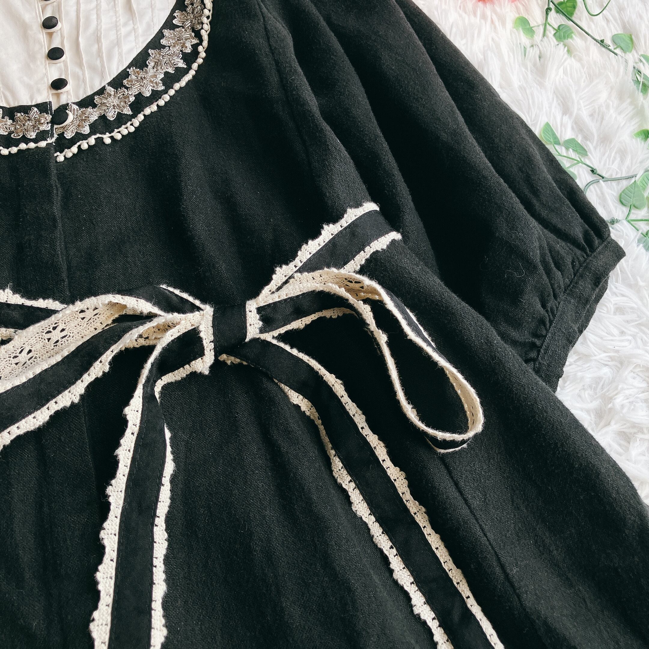 FURFUR ファーファー★リネン パフスリーブ アシンメトリー ロングワンピース Aライン ビジュー フリル レース ベルト付き ブラック×アイボリー