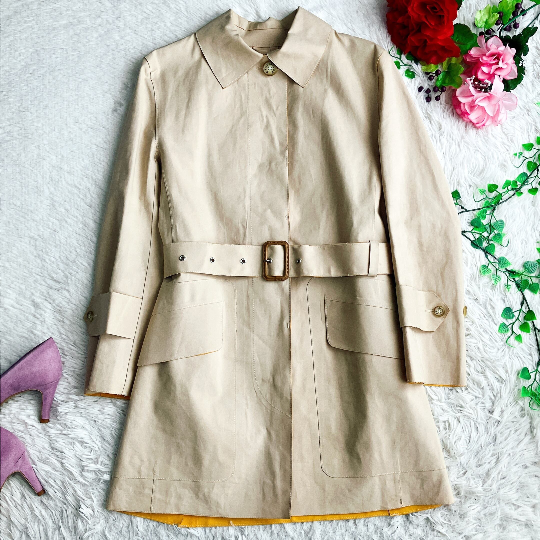 MACKINTOSH マッキントッシュ★ゴム引きコート 比翼ボタン バイカラー ステンカラーコート ベルト付き ベージュ×オレンジ