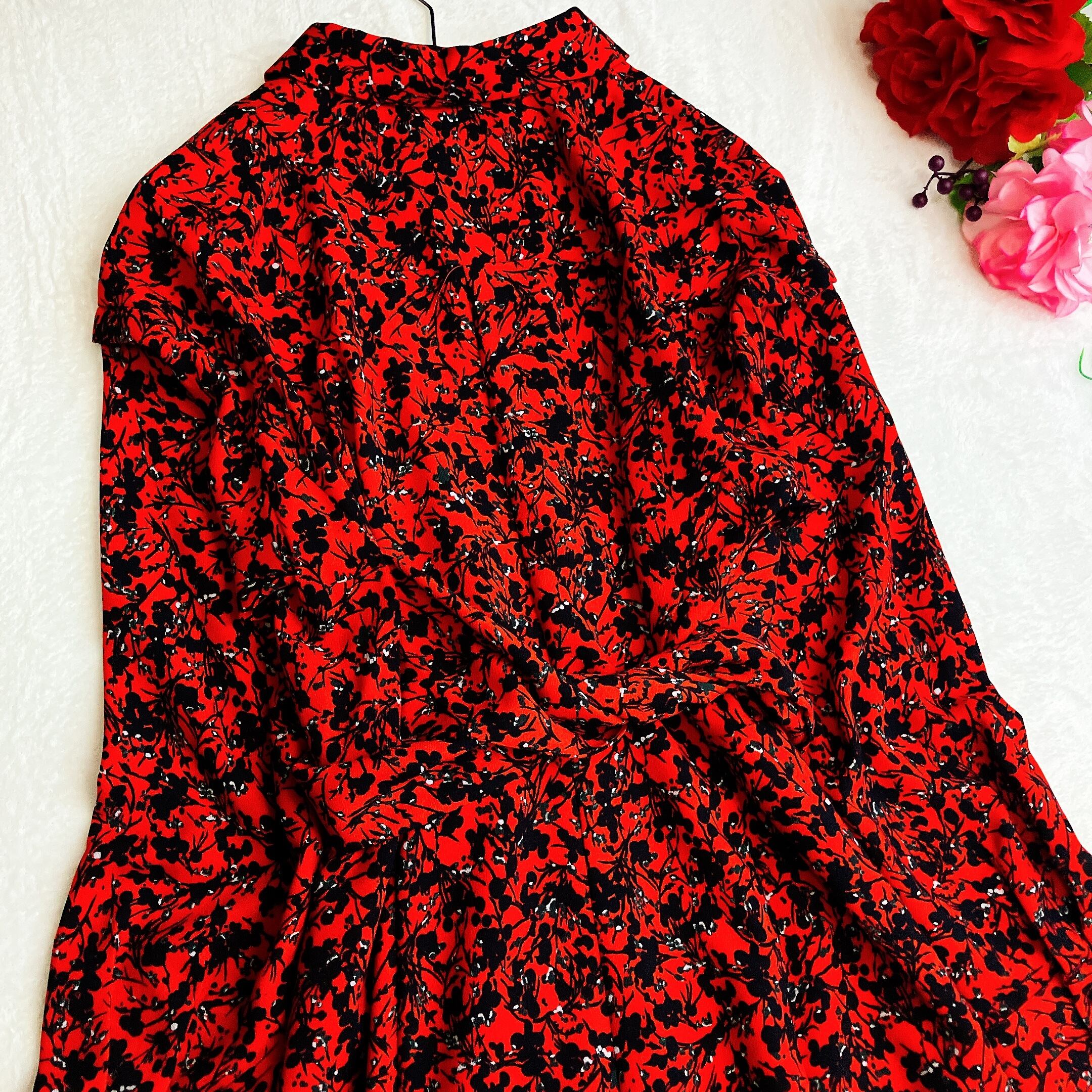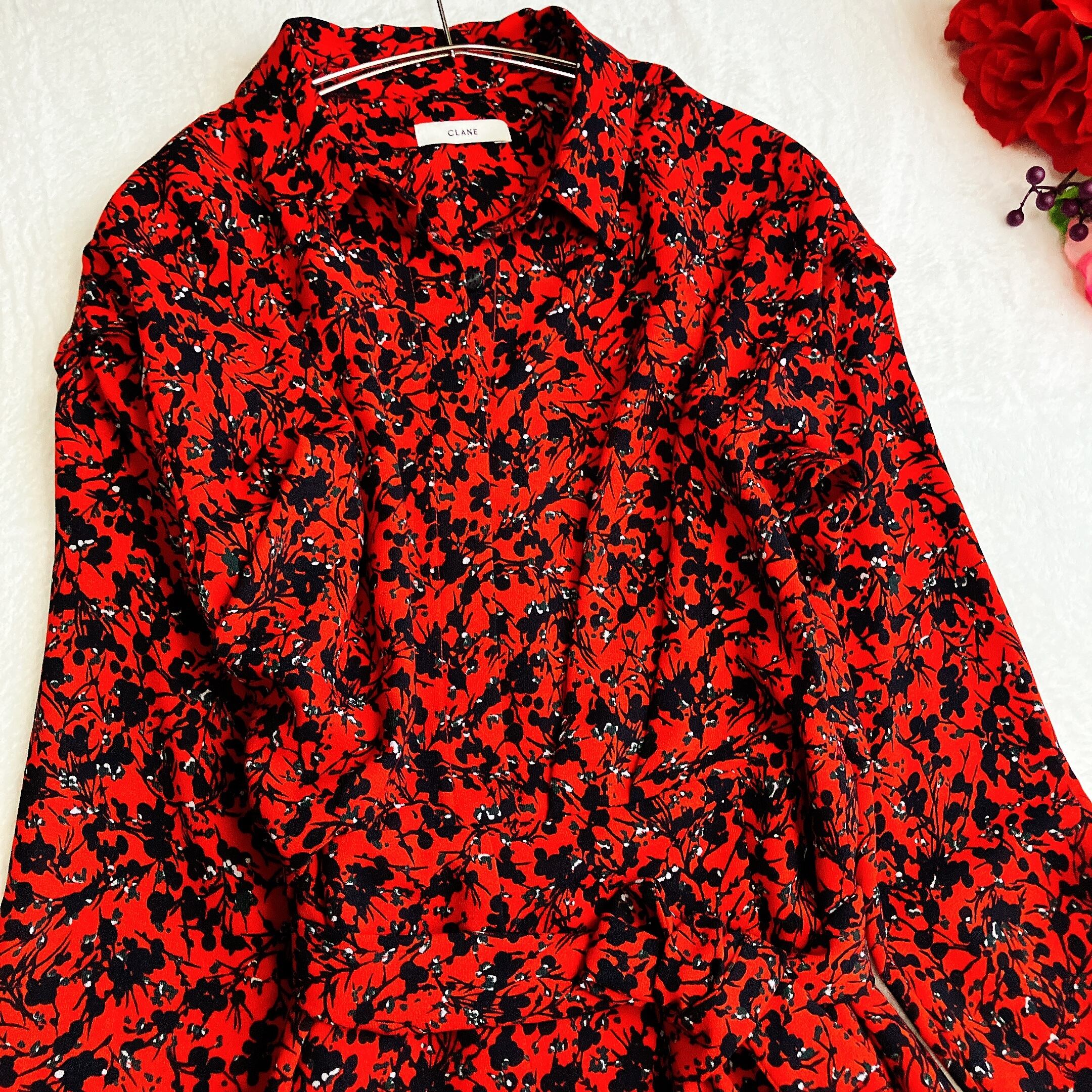 CLANE クラネ★マキシ丈 花柄 Aライン ワンピース 長袖 ウエストマーク ベルト付 レッド×ブラック【リユース極美品】【比翼ボタン】
