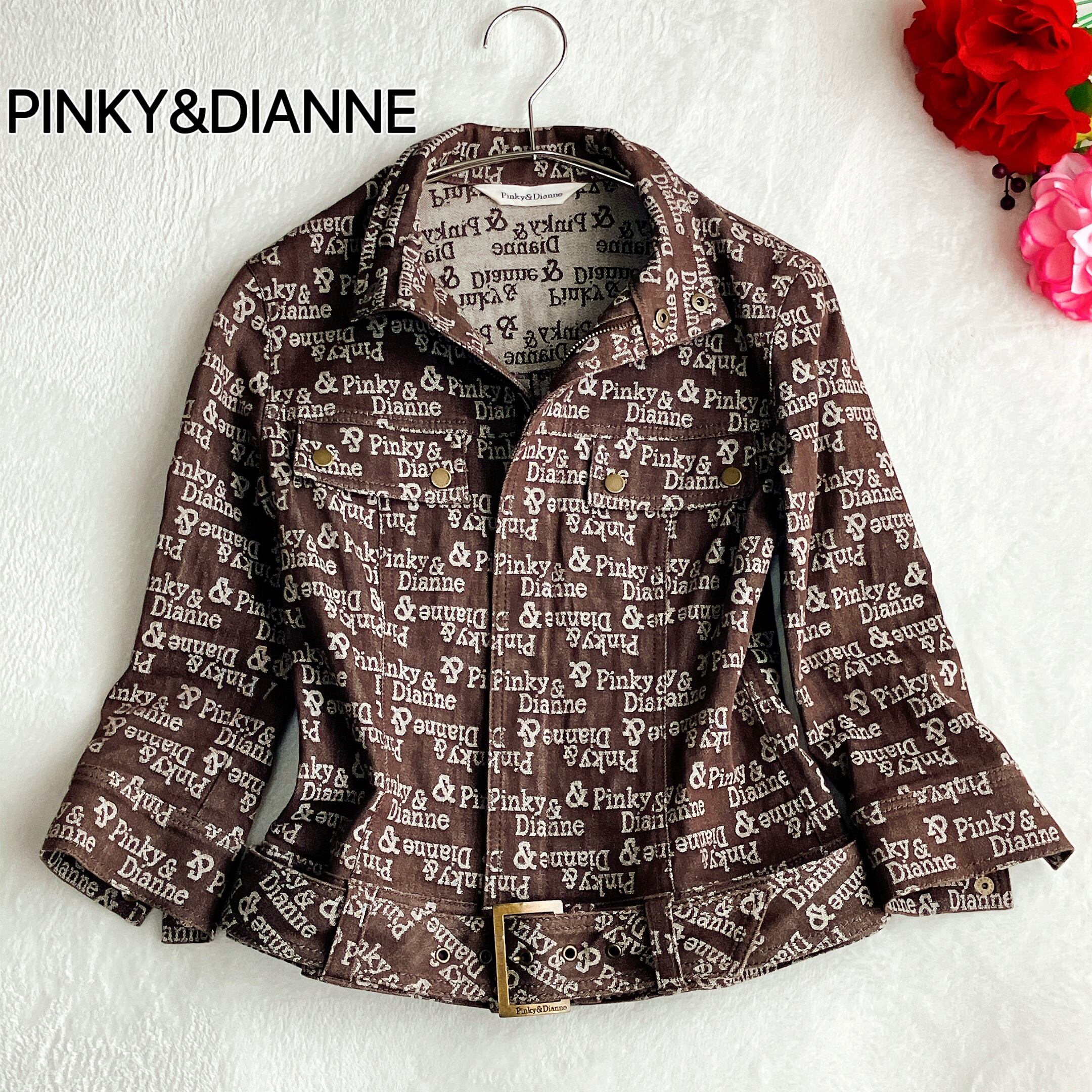 PINKY&DIANNE ピンキーアンドダイアン★ロゴ総柄 ストレッチ デニムジャケット 七分袖 ベルト付き ブラウン【リユース美品】