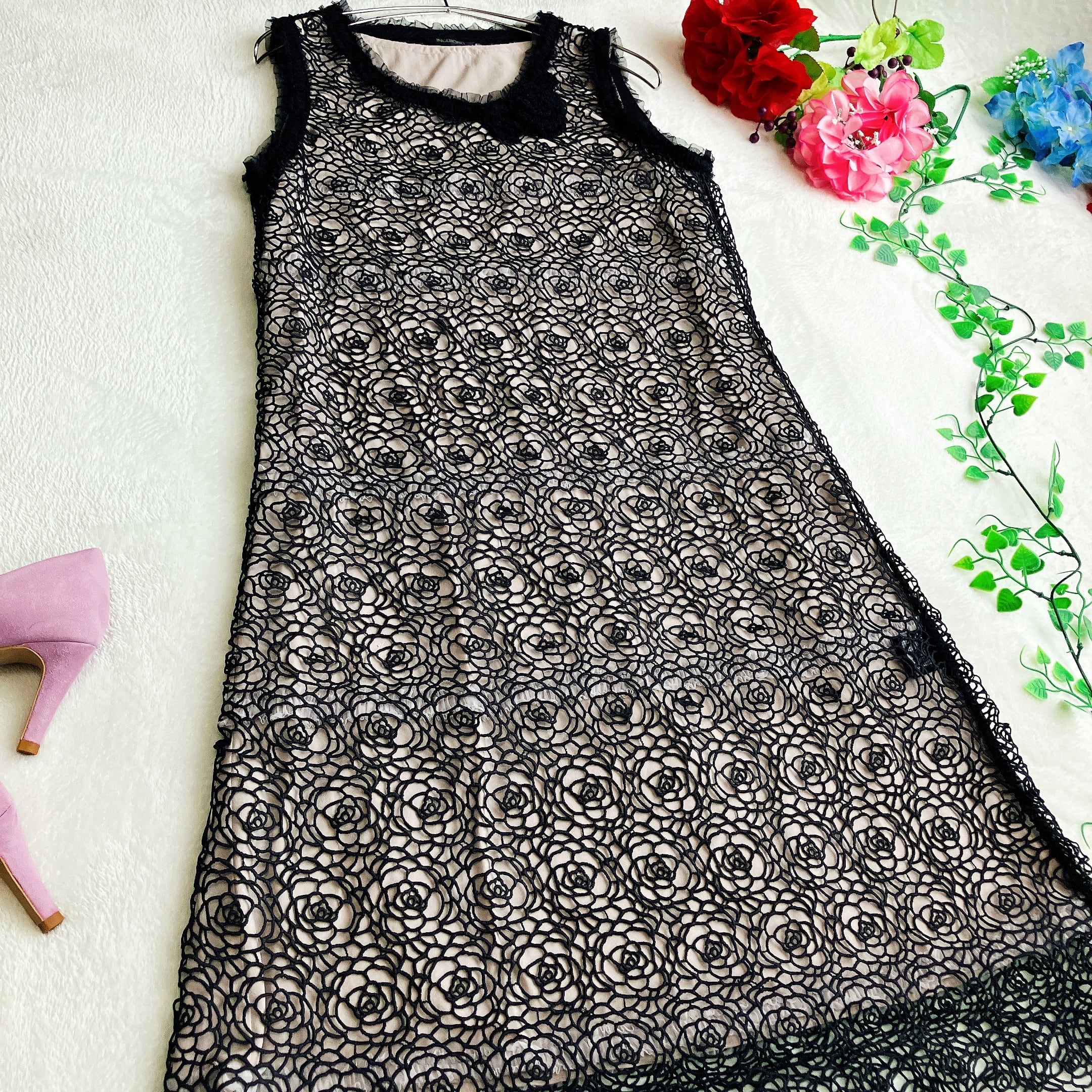 繊細な総レースと上品な花柄デザインが魅力のワンピース。ブラック×ベージュの配色が大人の華やかさを演出し、フォーマルシーンやお呼ばれにもぴったりです。