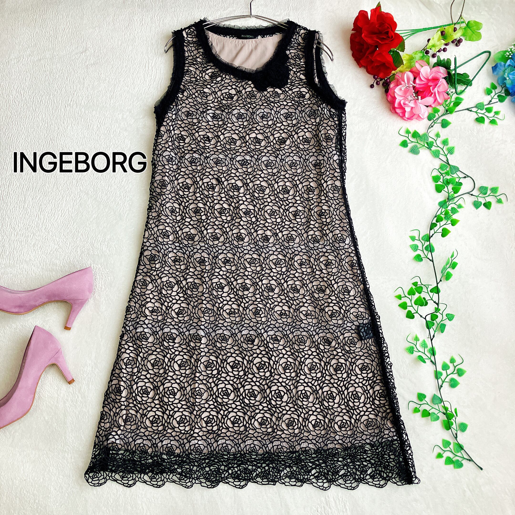 インゲボルグ INGEBORG★総レース コサージュ フリル 花柄 ワンピース Aライン ノースリーブ ブラック×ベージュ【美品】【インナー付き】