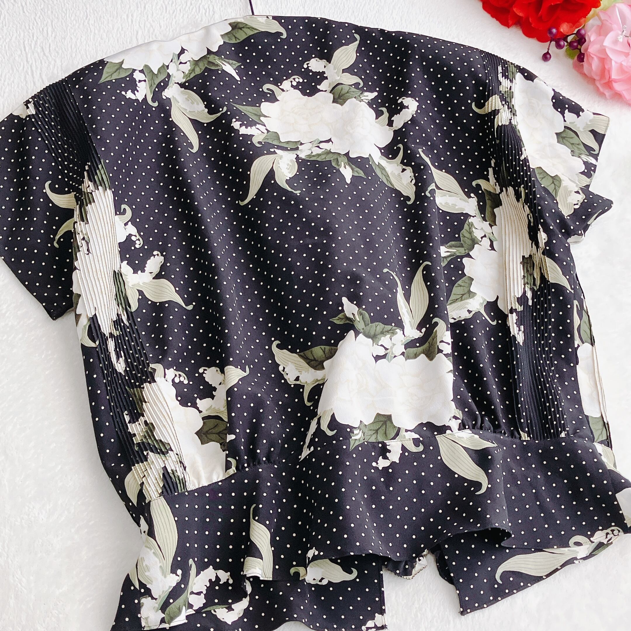INGEBORG インゲボルグ★ピコフリル マルチリボン ピンタック ノーカラー ブラウス 花柄 ドット Vネック 半袖 ブラック×マルチ【美品】