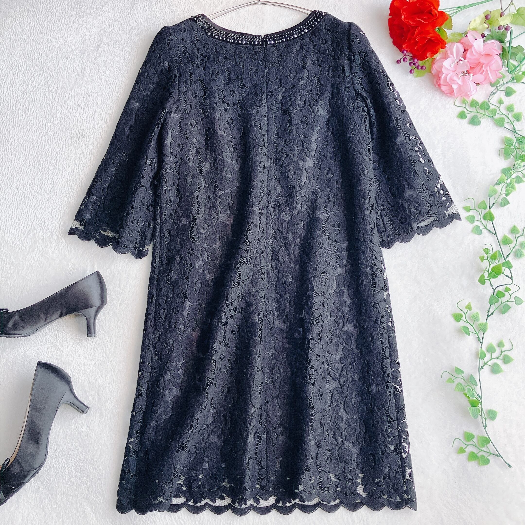 M-premierBLACK エムプルミエブラック★総レース ワンピース ビジュー 花柄 Aライン ブラックフォーマル【美品】【オケージョン】