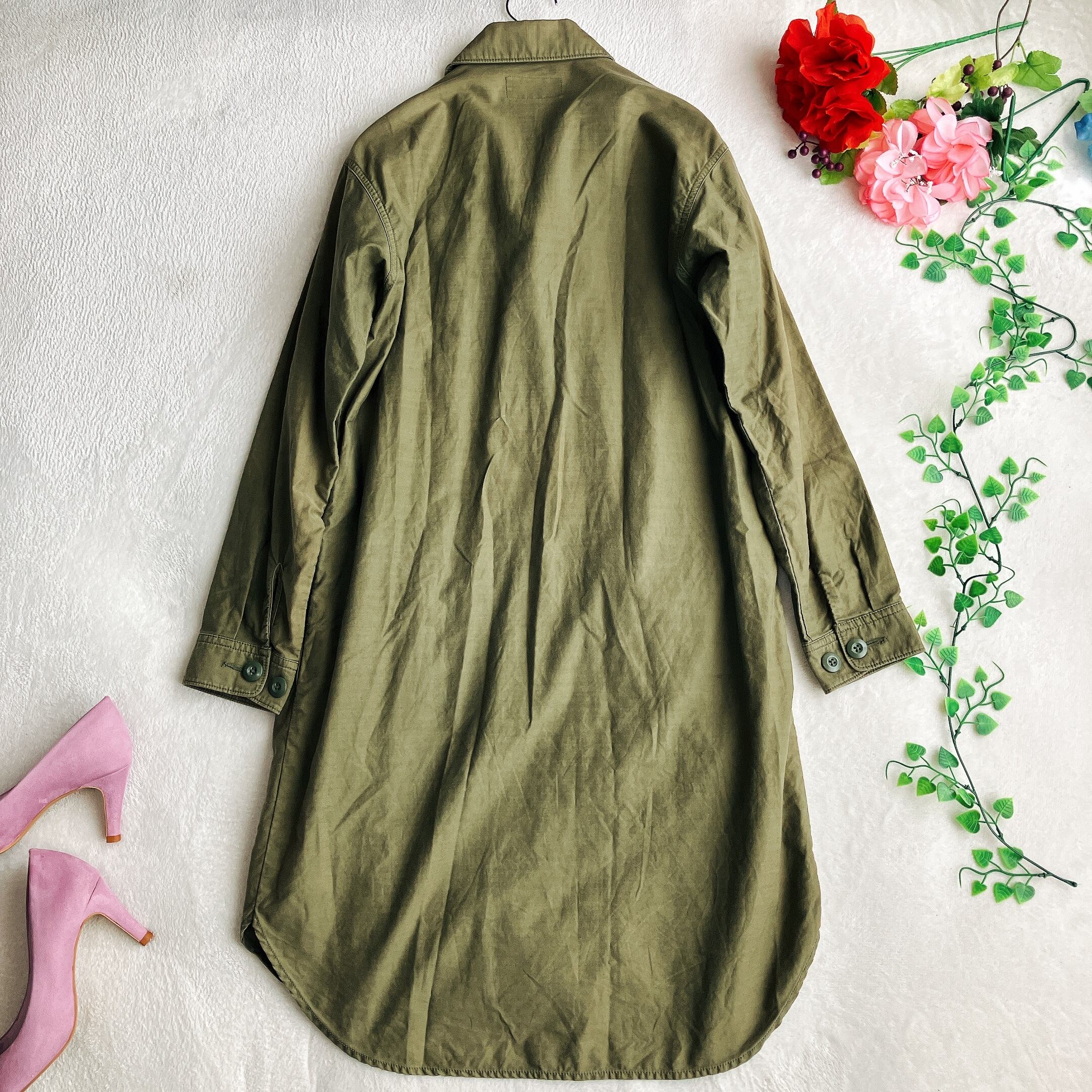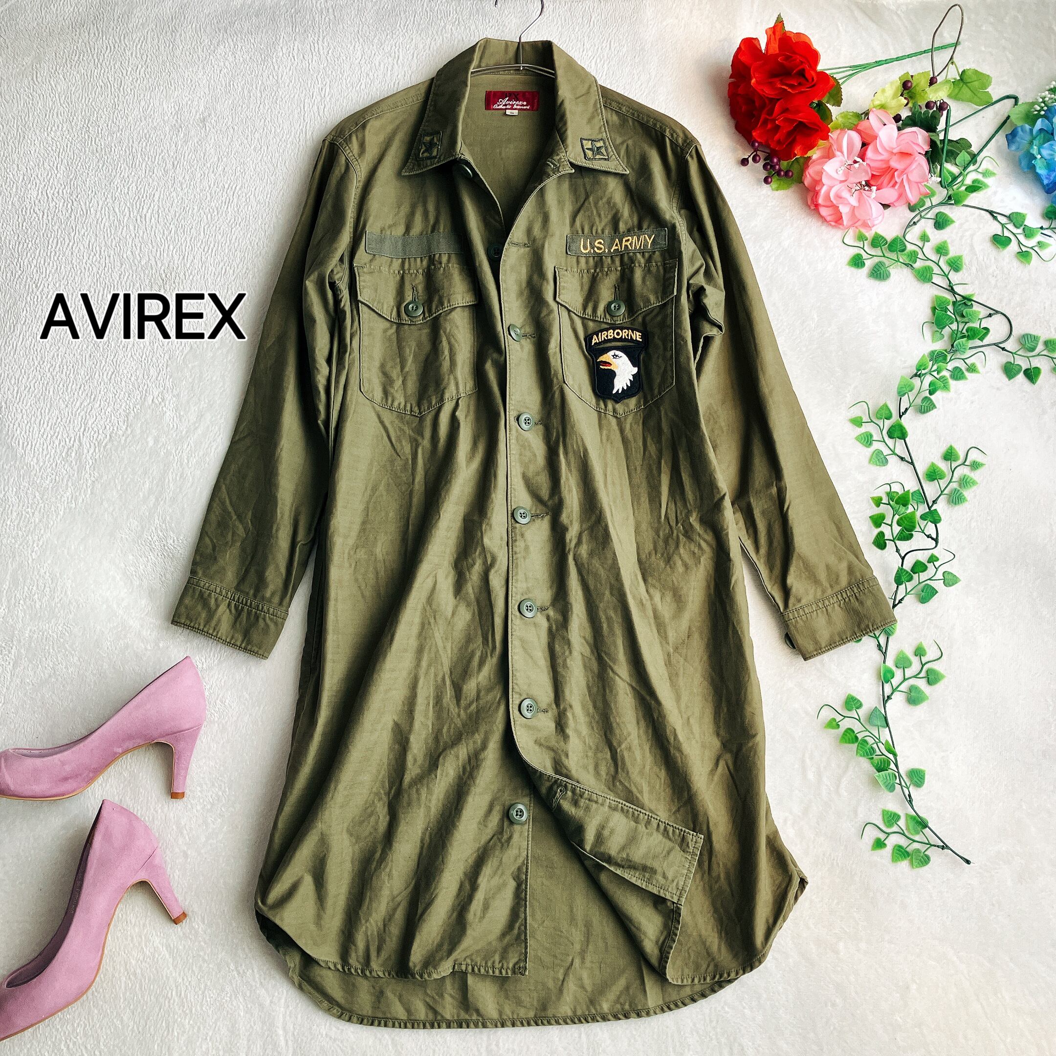アヴィレックス AVIREX★ミリタリーシャツワンピース 長袖 刺繍 ワッペン ビッグシルエット オリーブ系【美品】【洗える】