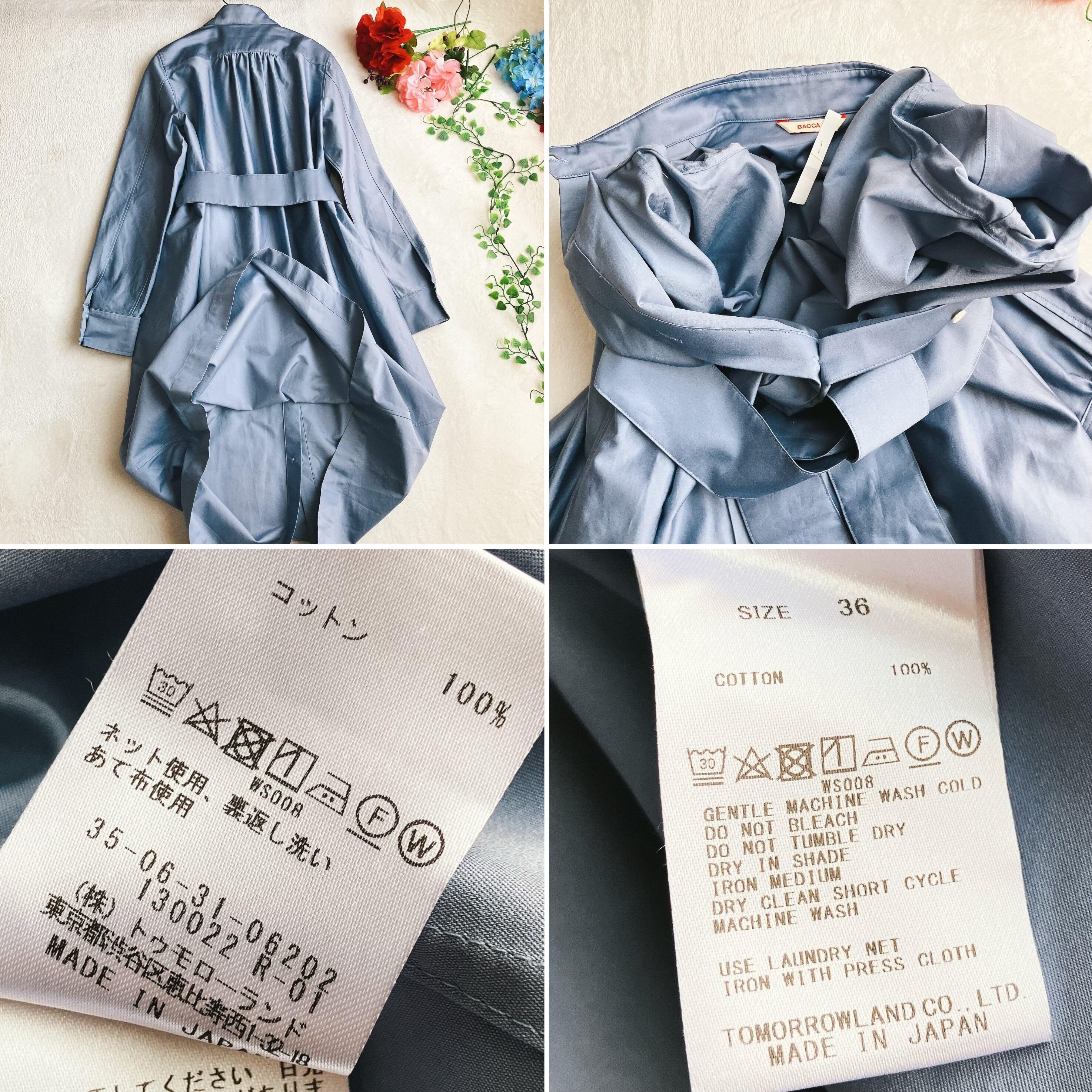 【23SS】BACCA バッカ/トゥモローランド★コットンバックサテンコートドレス Aライン シャツワンピース 光沢 ブルー系【美品】【ベルト付】