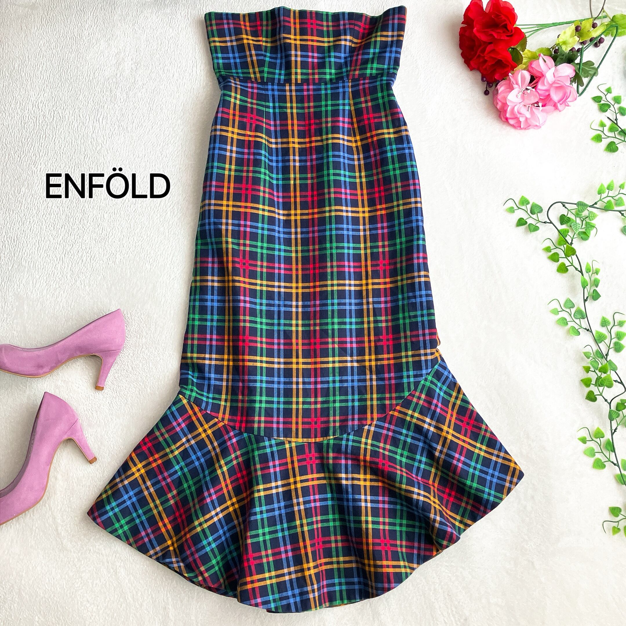 【美品】エンフォルド ENFOLD★ハイウエスト アシンメトリー マーメイド ロングスカート マドラスチェック マルチカラー