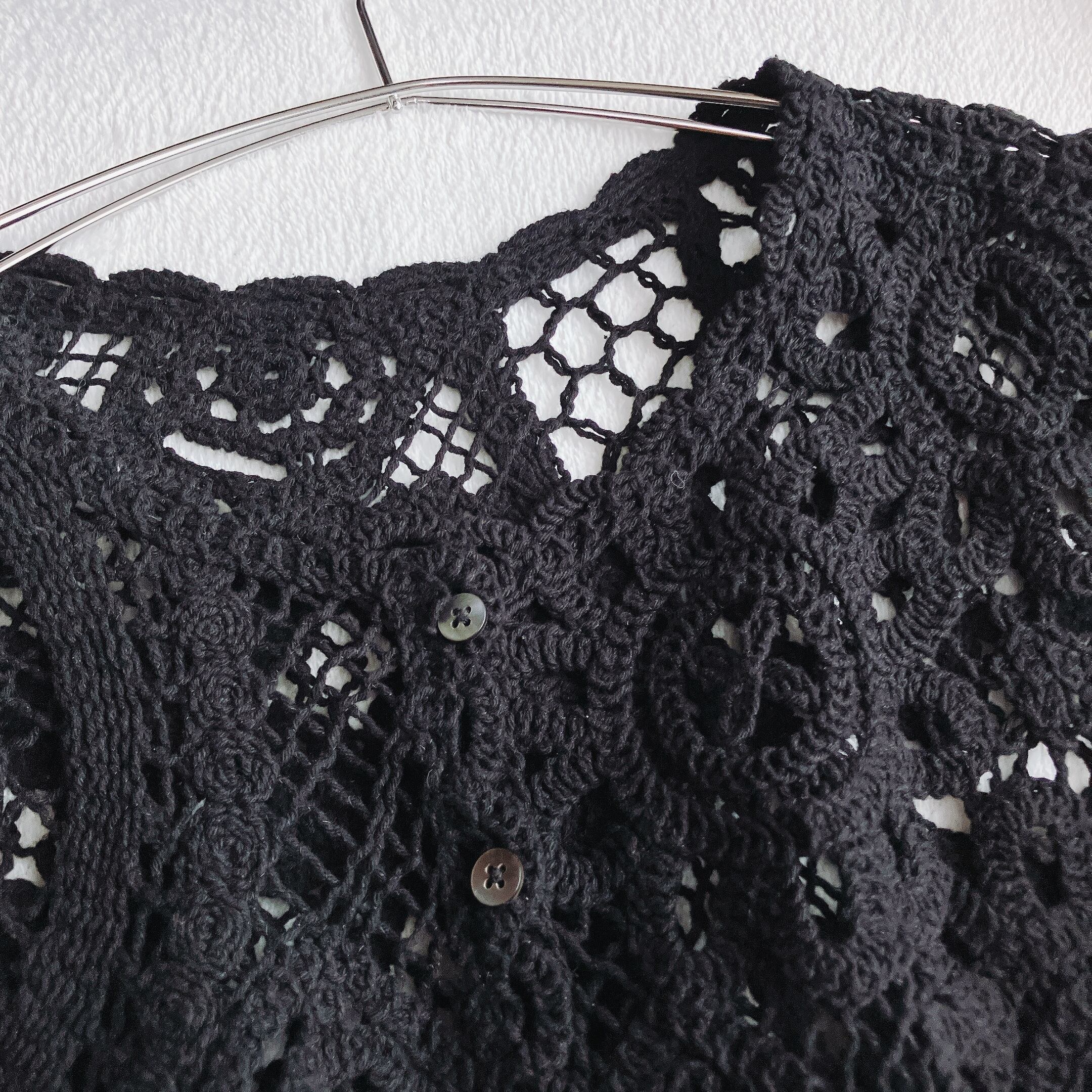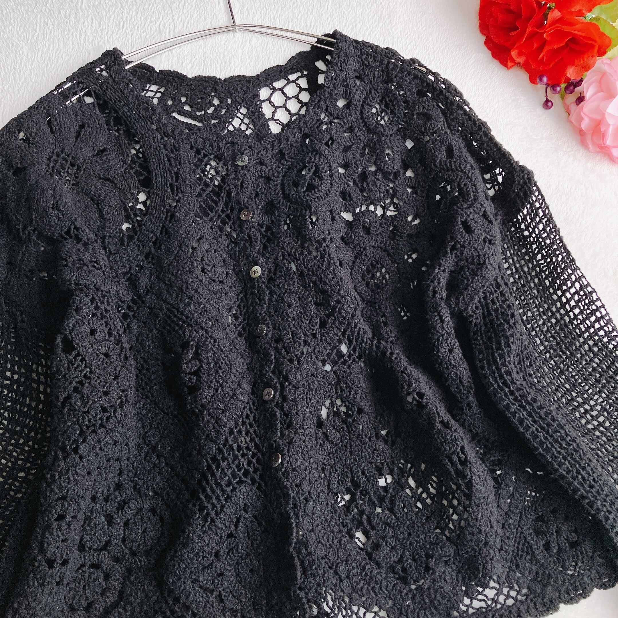 SALON adam et ropé サロン アダムエロペ★クロシェニット 花柄 カーディガン ドロップショルダー フレアスリーブ ブラック