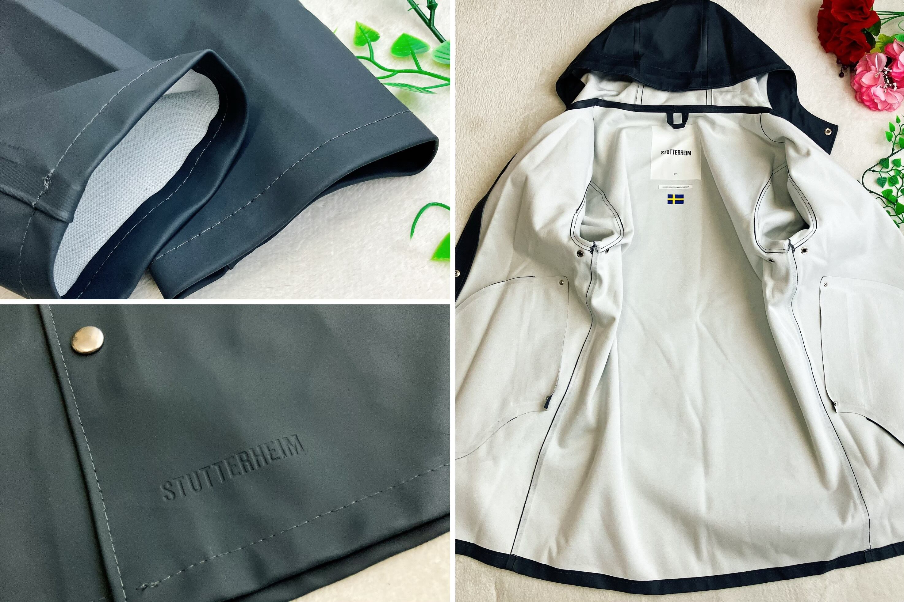 厚手のラバーコーティングが施された生地は、防水性に優れ雨の日でも安心。耐久性も高く、長く愛用できる高品質なレインウェアです。