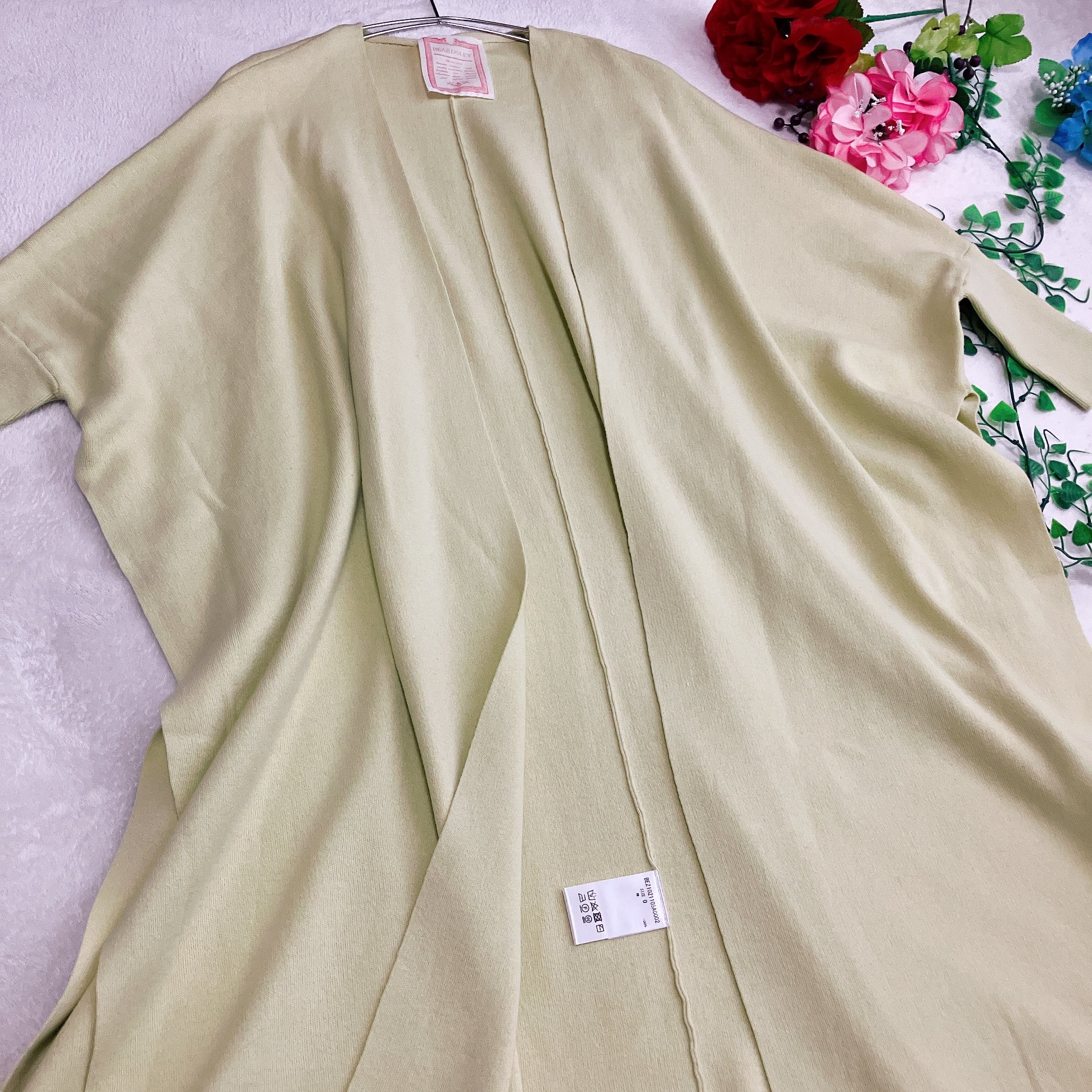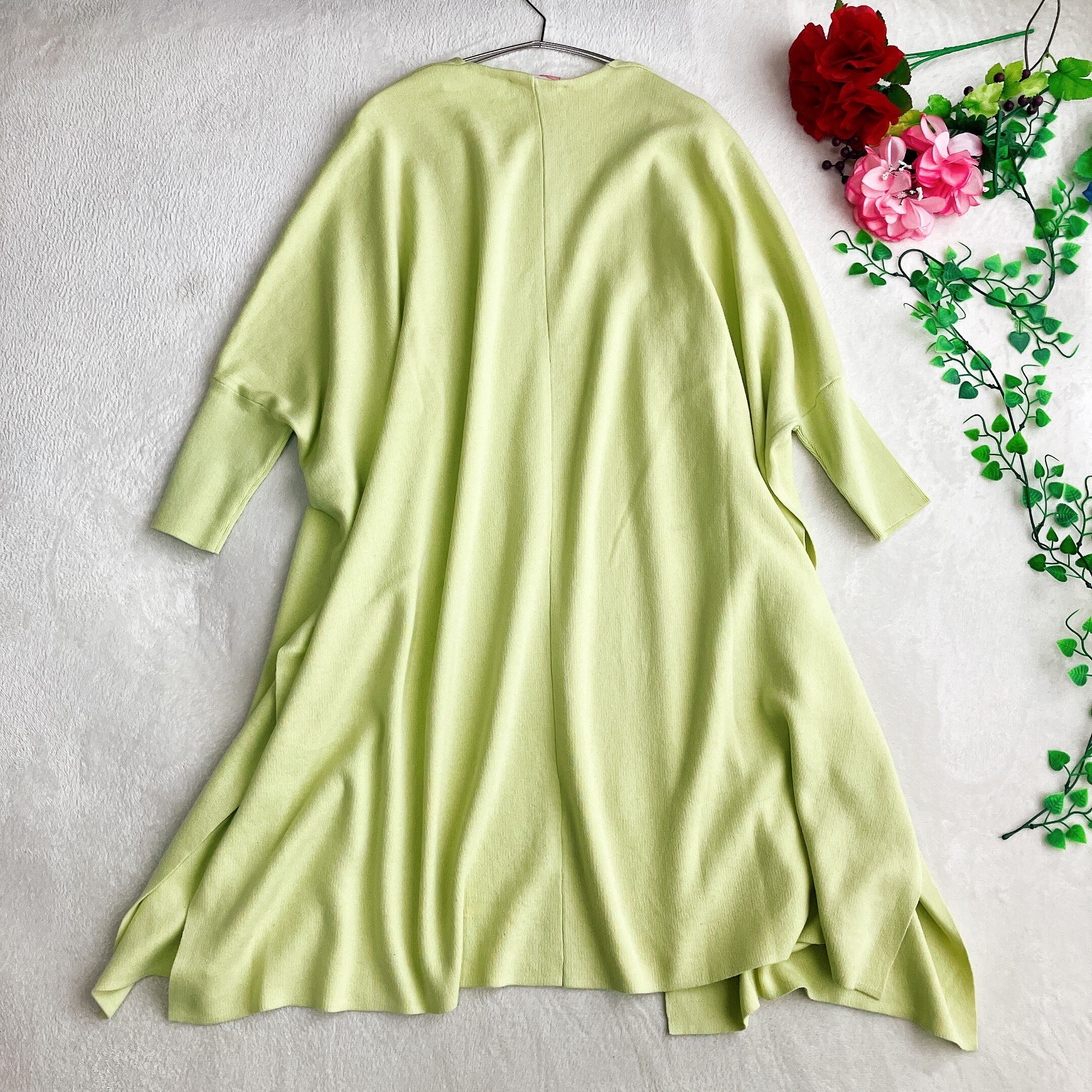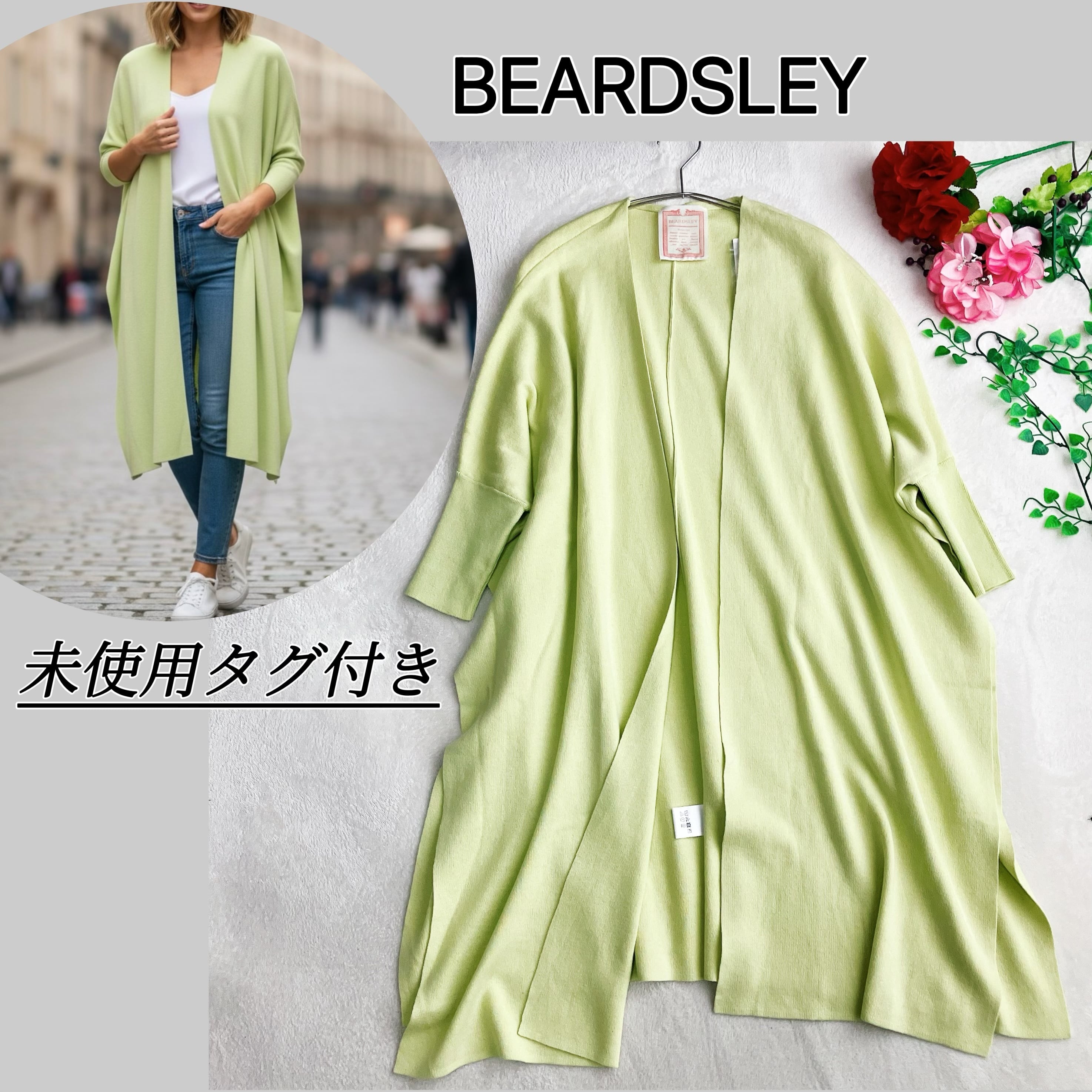 【未使用タグ付き】【体型カバー】ビアズリー BEARDSLEY★ドルマンスリーブ ロングカーディガン ビッグシルエット コットン ライムグリーン