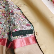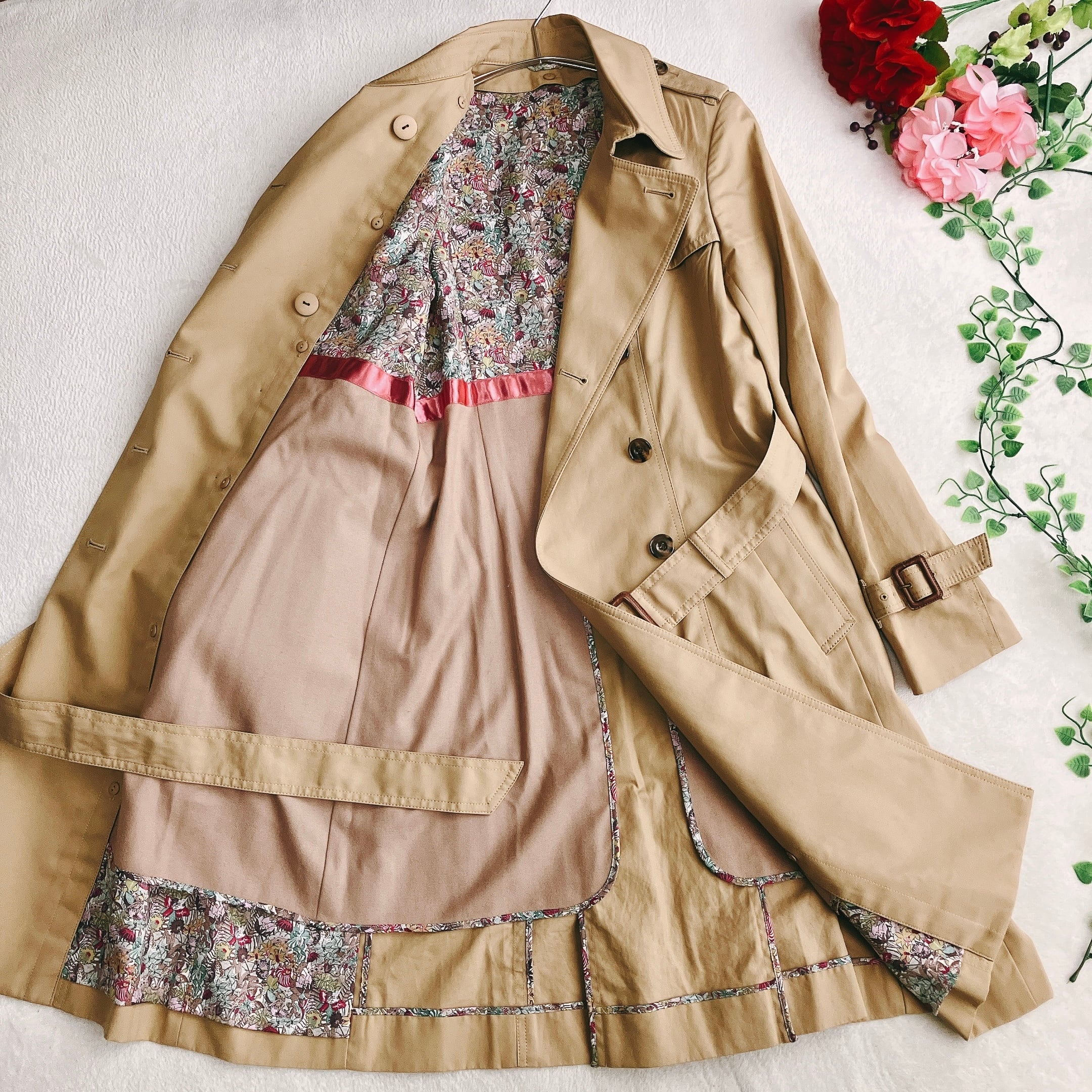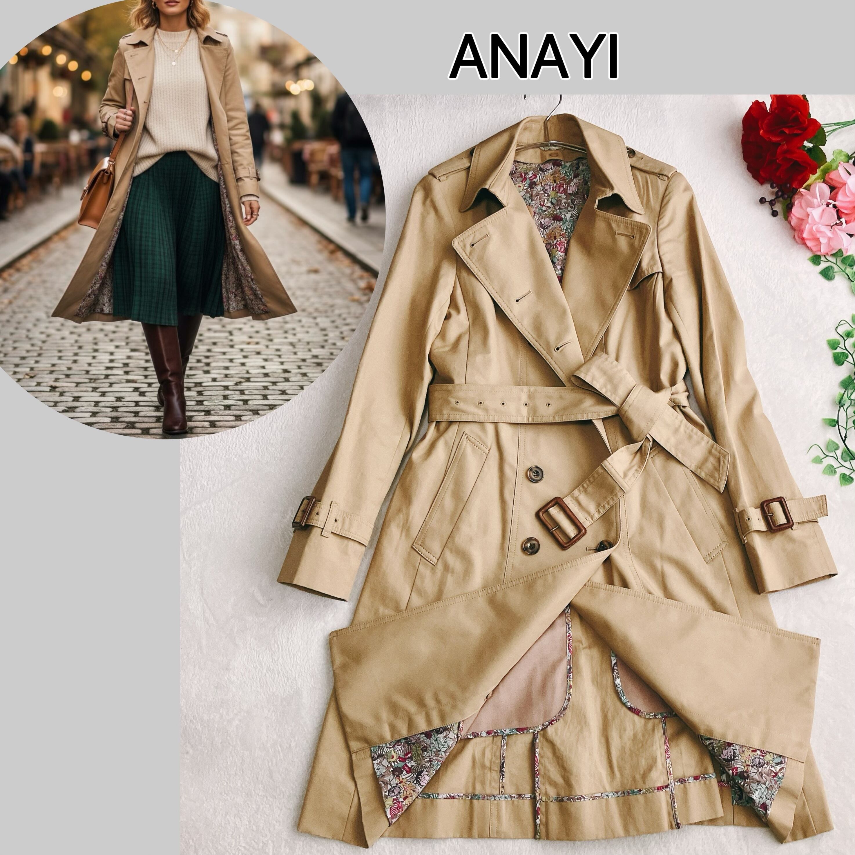 アナイ ANAYI★撥水 トレンチコート ダブル カシミヤ ウール ライナー付き 花柄 Aライン ベルト付き ベージュ系