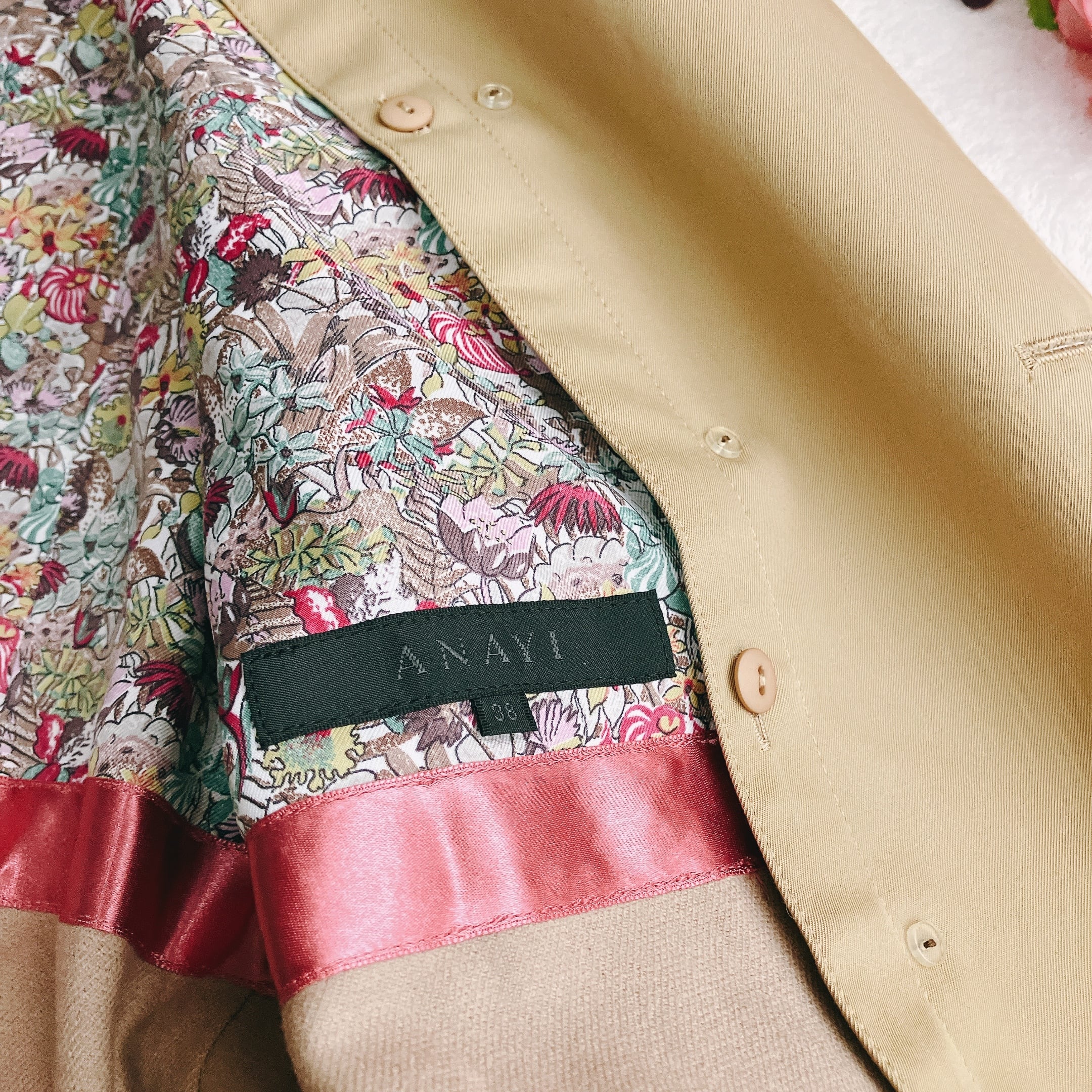 上品なAラインと花柄裏地がANAYIらしいエレガンスを演出。スタイルアップが叶うベルト付きデザイン。