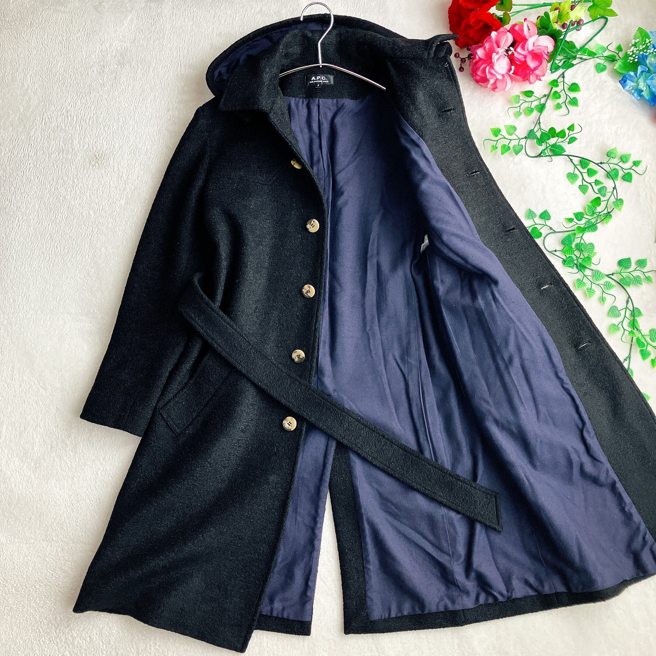 アーペーセー A.P.C.★ウールメルトン フーデッド ロングコート Aライン ベルト付き バイカラー ブラック系