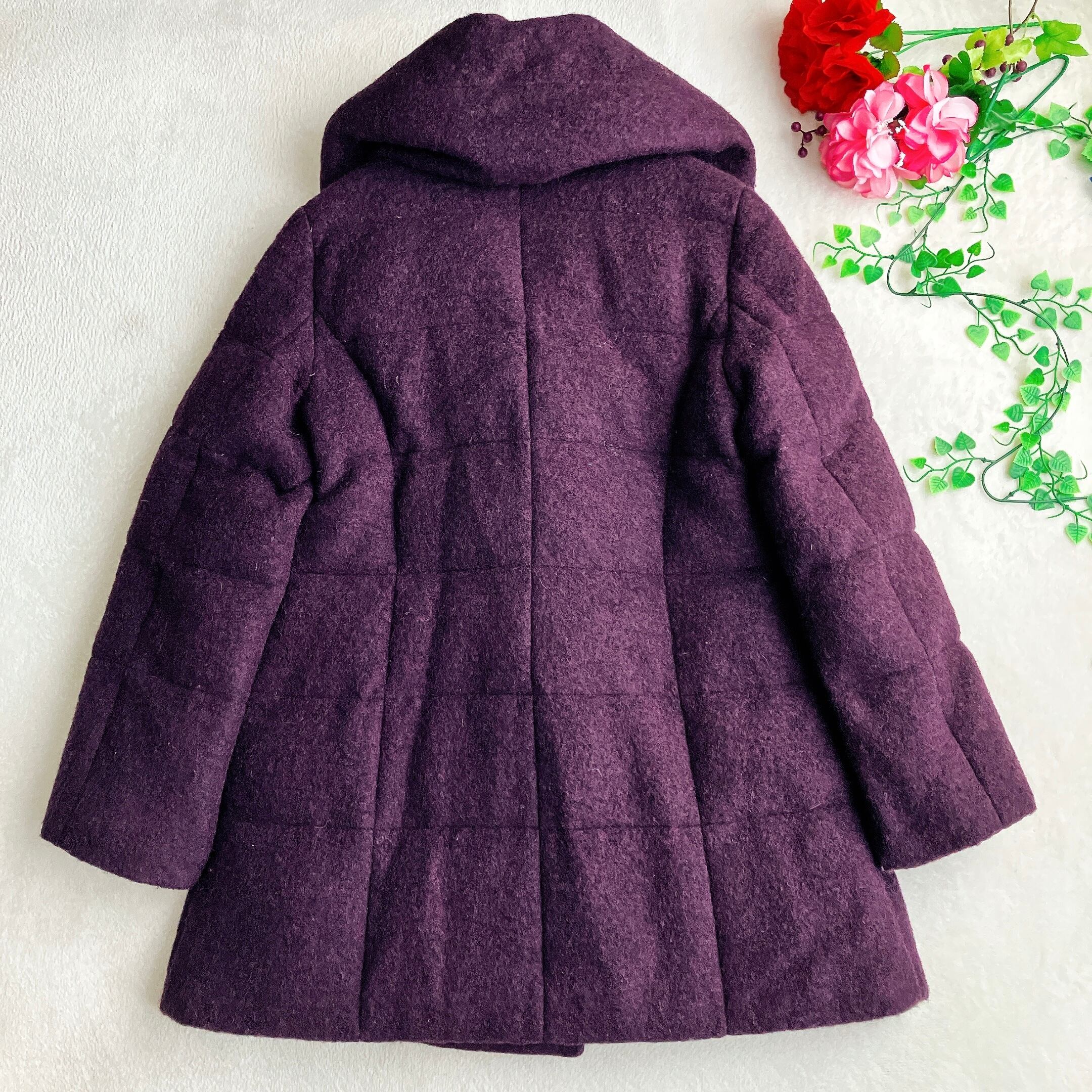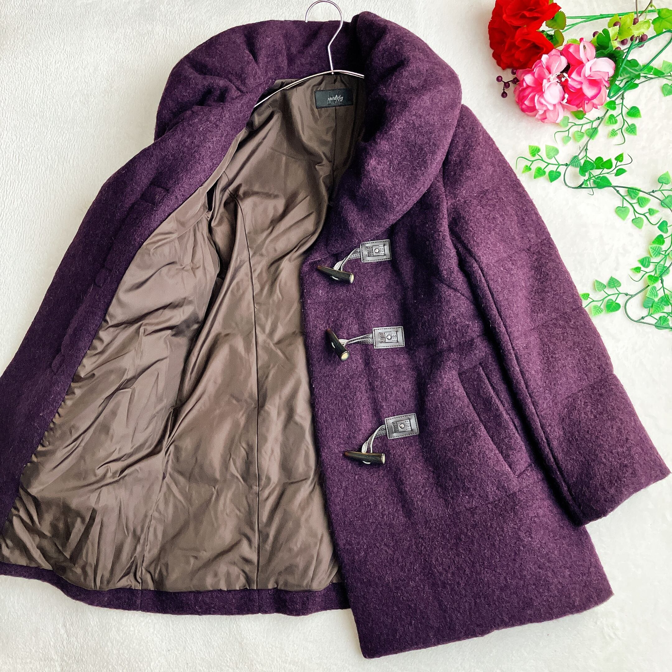 【美品】modify モディファイ★ショールカラー ウール ダウンコート Aライン ダッフルコート トグルボタン 小顔効果 パープル系