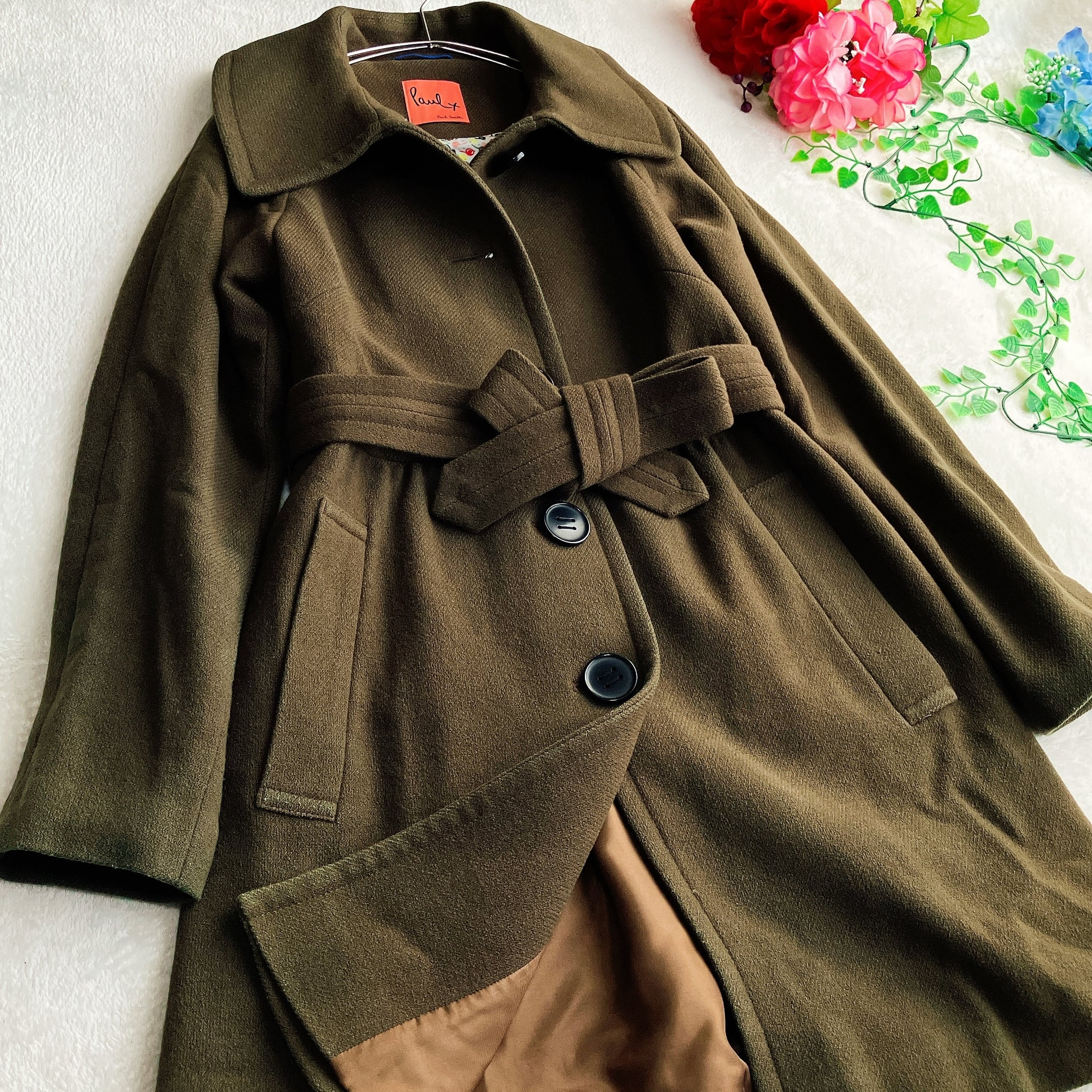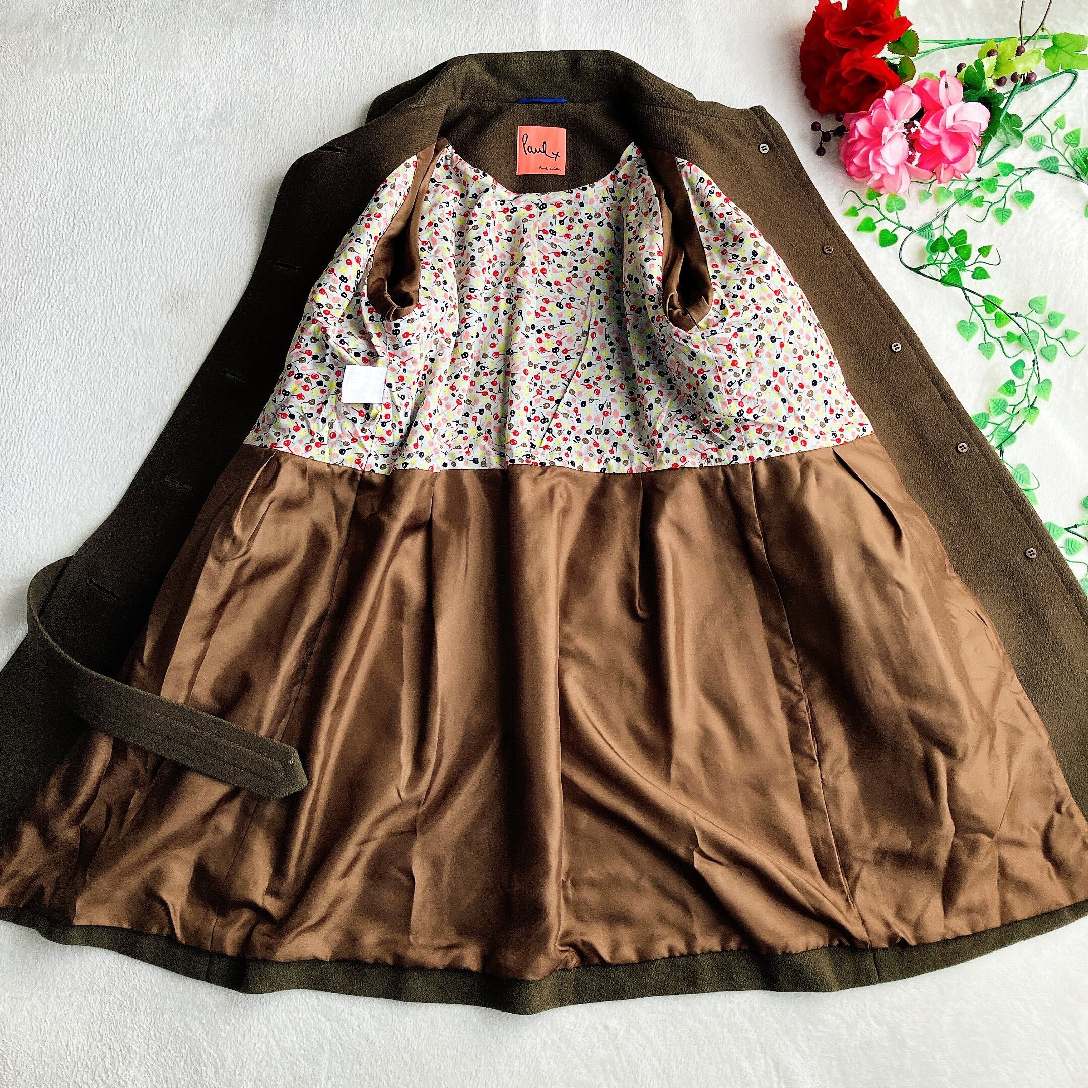 【美品】Paul Smith ポールスミス★ビッグカラー ステンカラーコート ギャザー Aライン ベルト付き オリーブブラウン系
