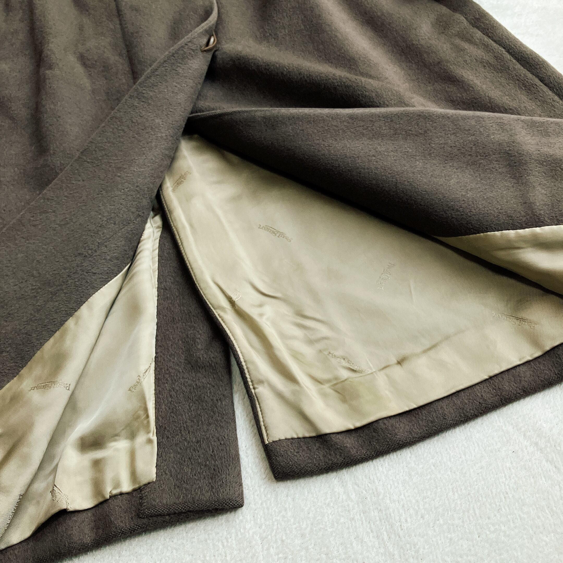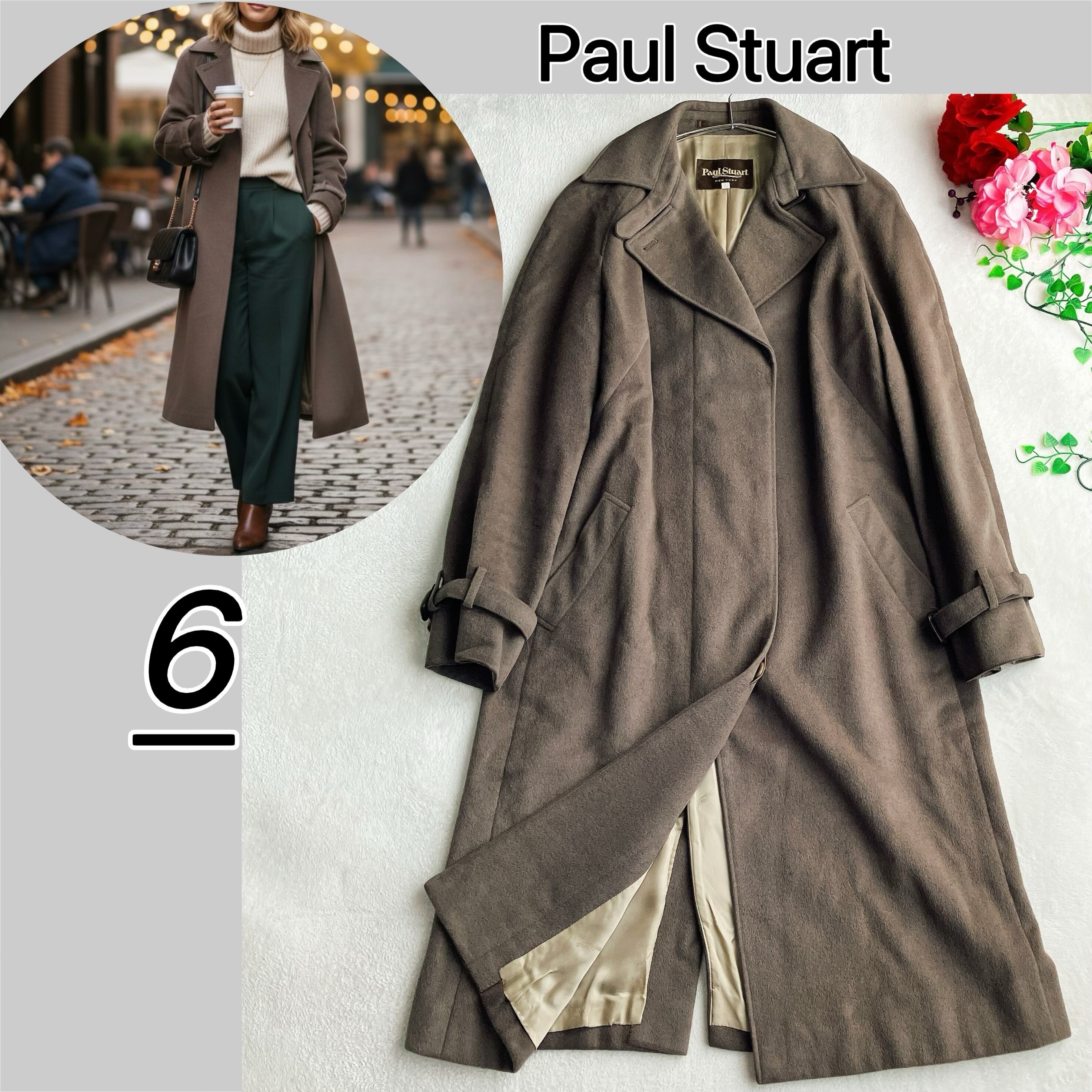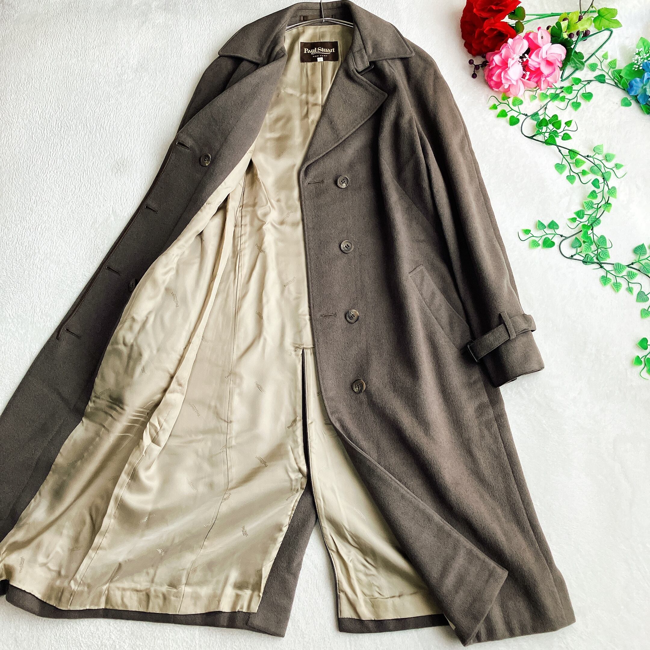 Paul Stuart ポールスチュアート★アンゴラ ウール チェスターコート ロング Aライン 比翼ボタン シャドウロゴ グレージュ系