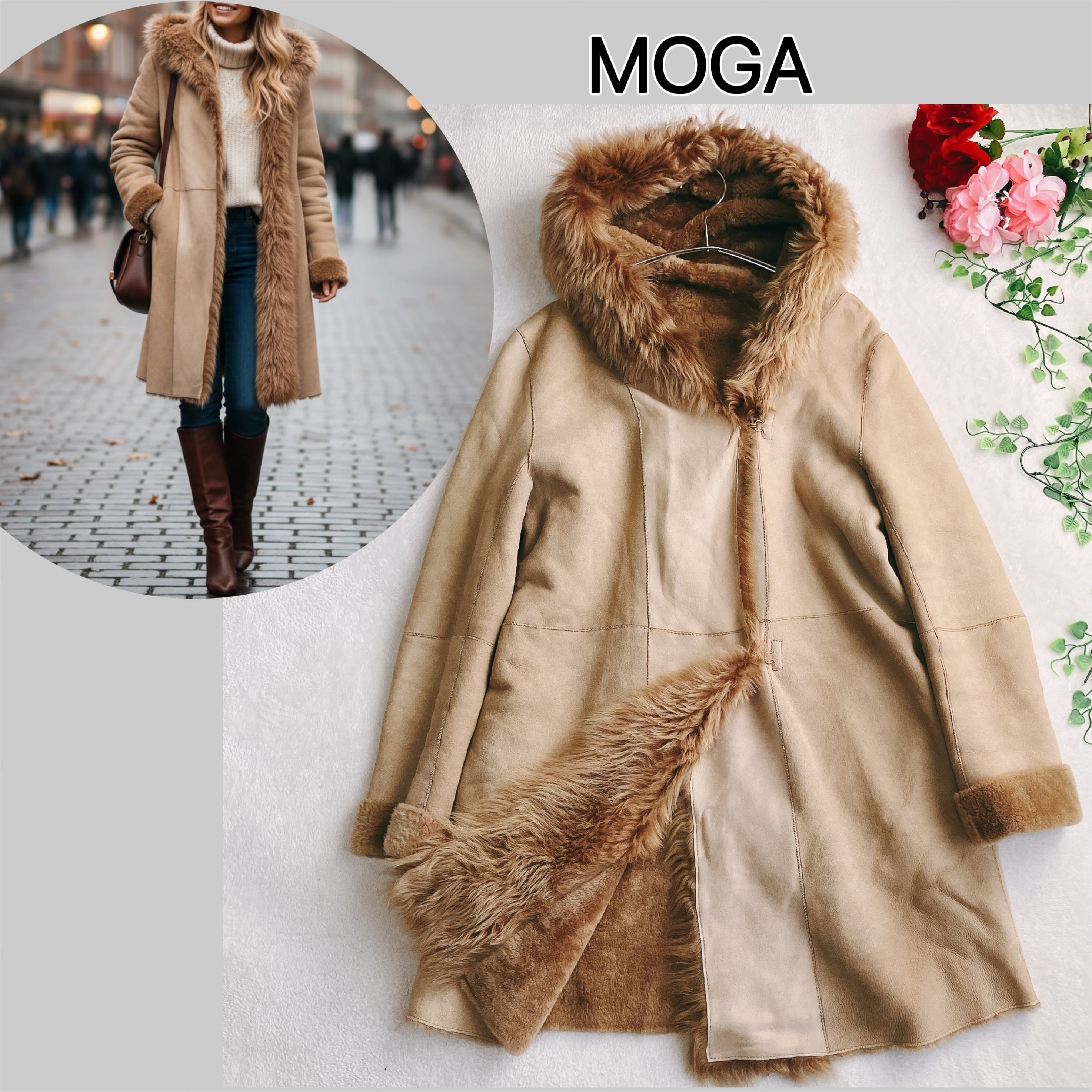 MOGA(モガ)らしい上品なムートンコート。内側までしっかりとムートンが施されており、防寒性が高く真冬でも暖かい一着です。フード付きで首元まで包み込み、寒い季節のアウターとして重宝します。