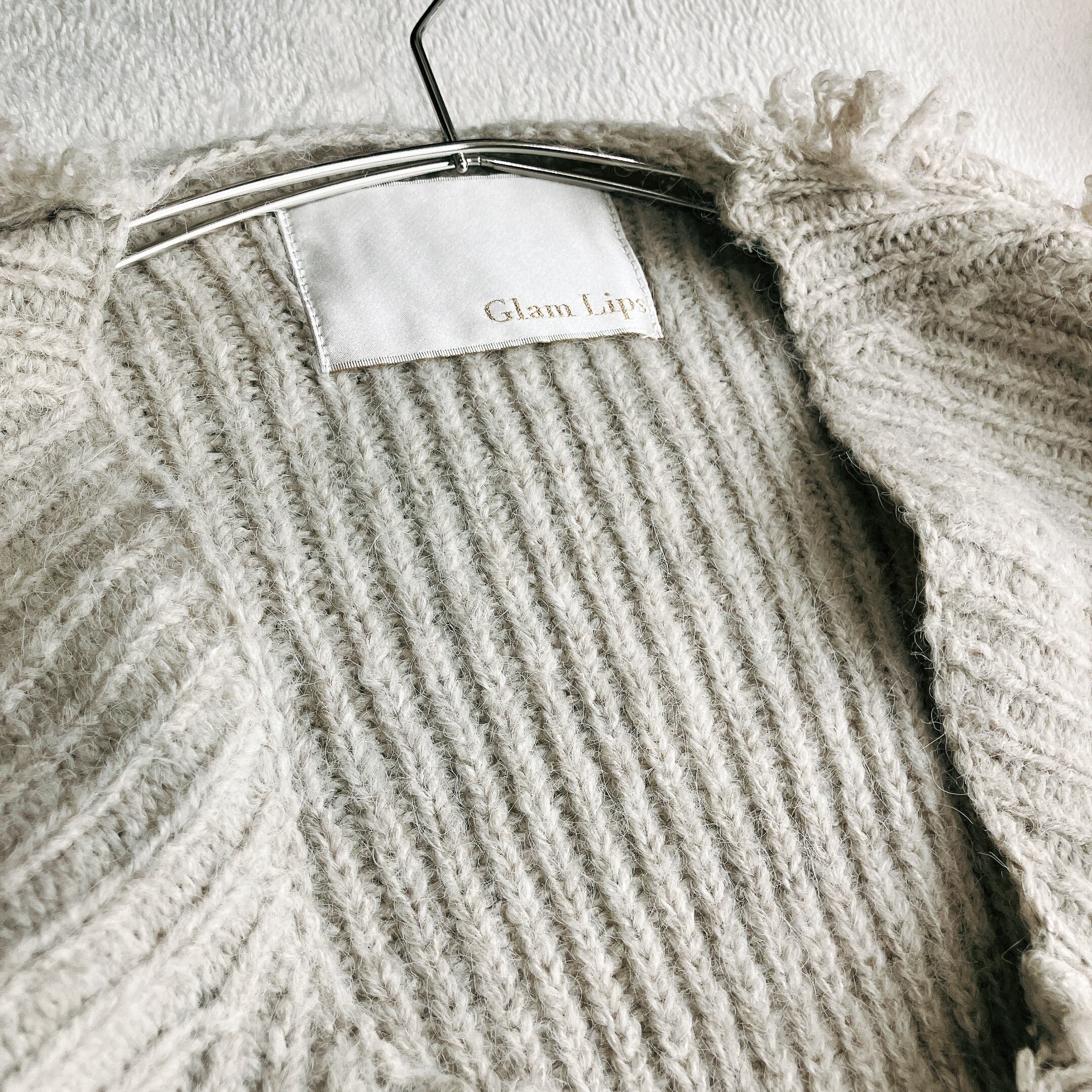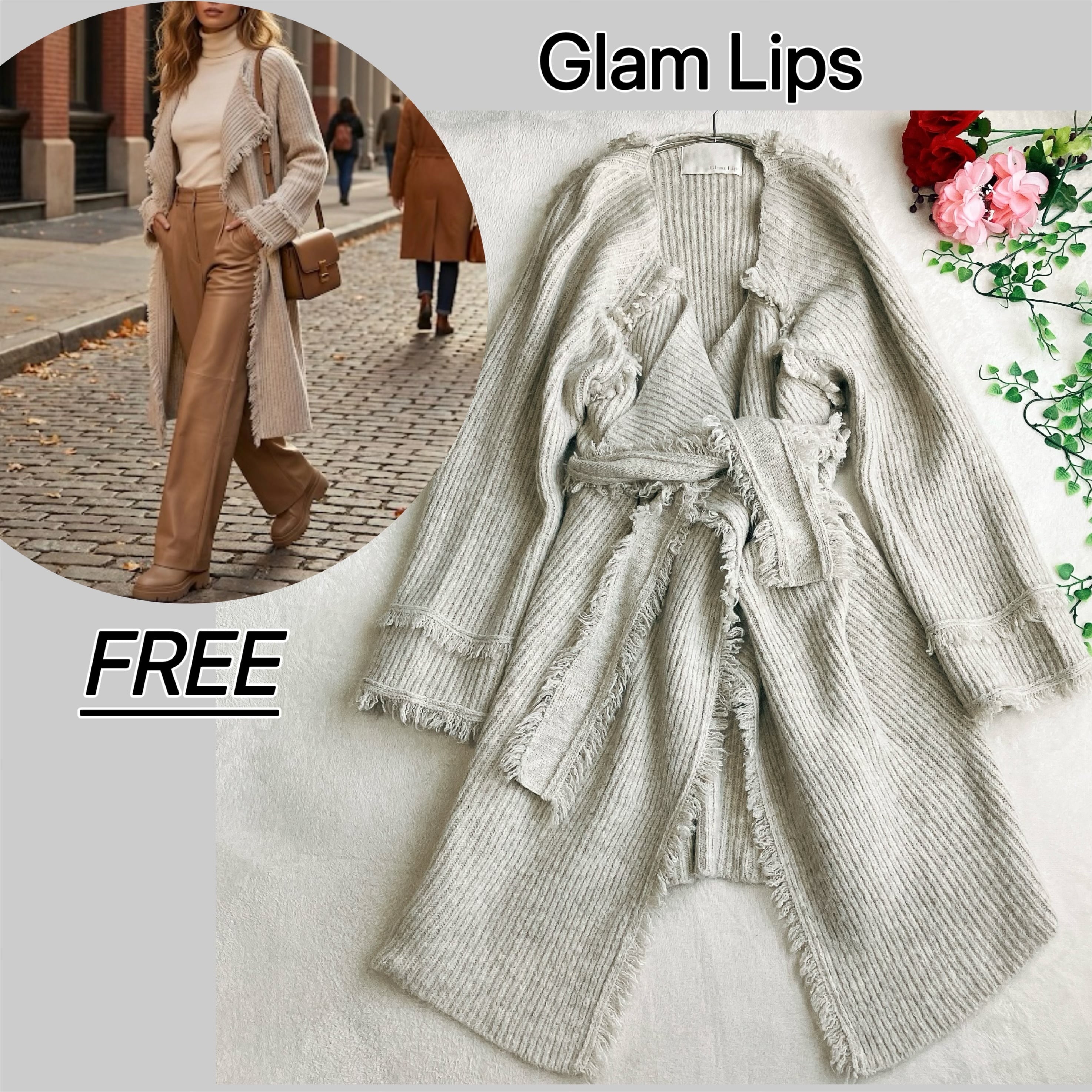Glam Lips グラムリップス★フリンジ ロングカーディガン ガウンコート ニットアウター ベルト付き オートミールシュガー