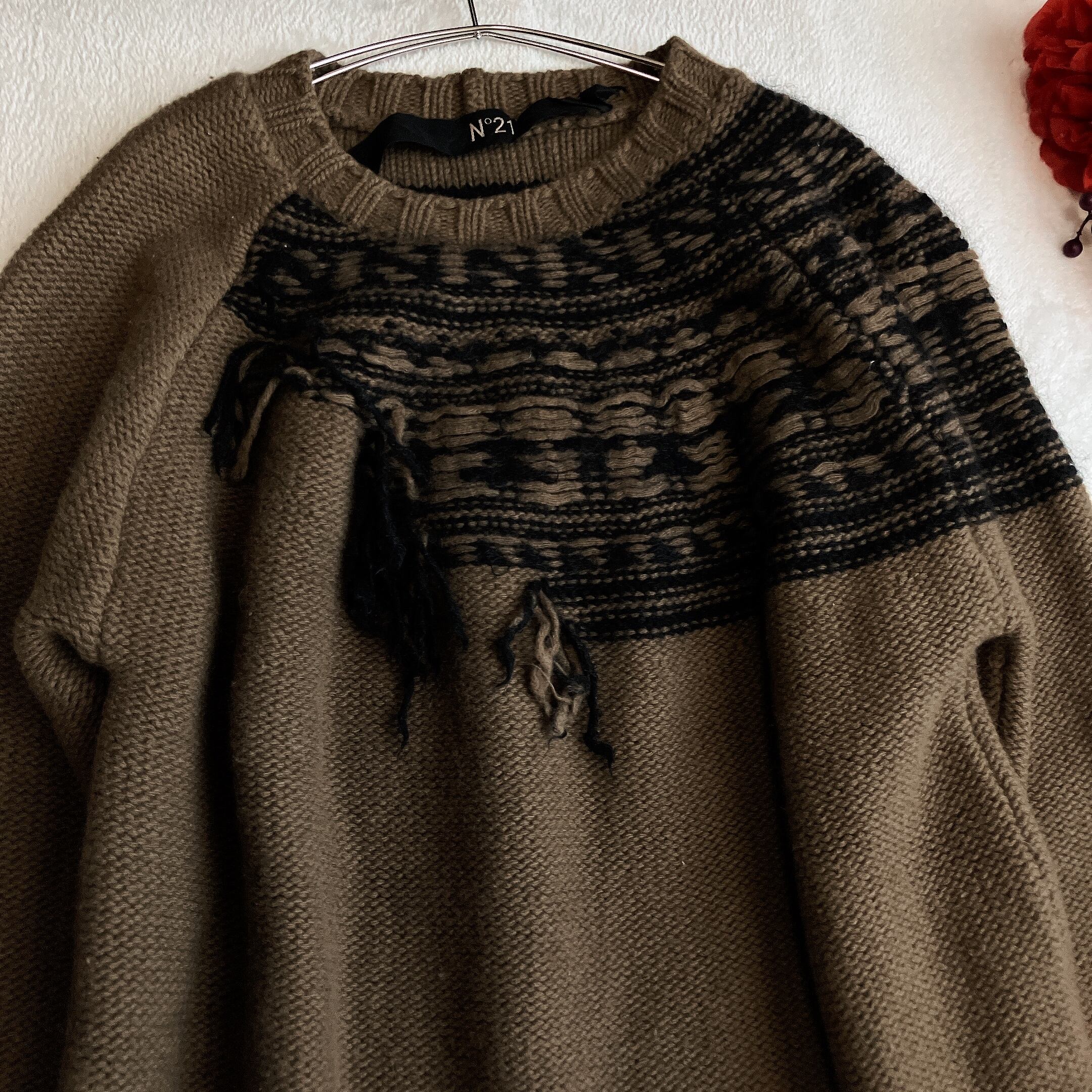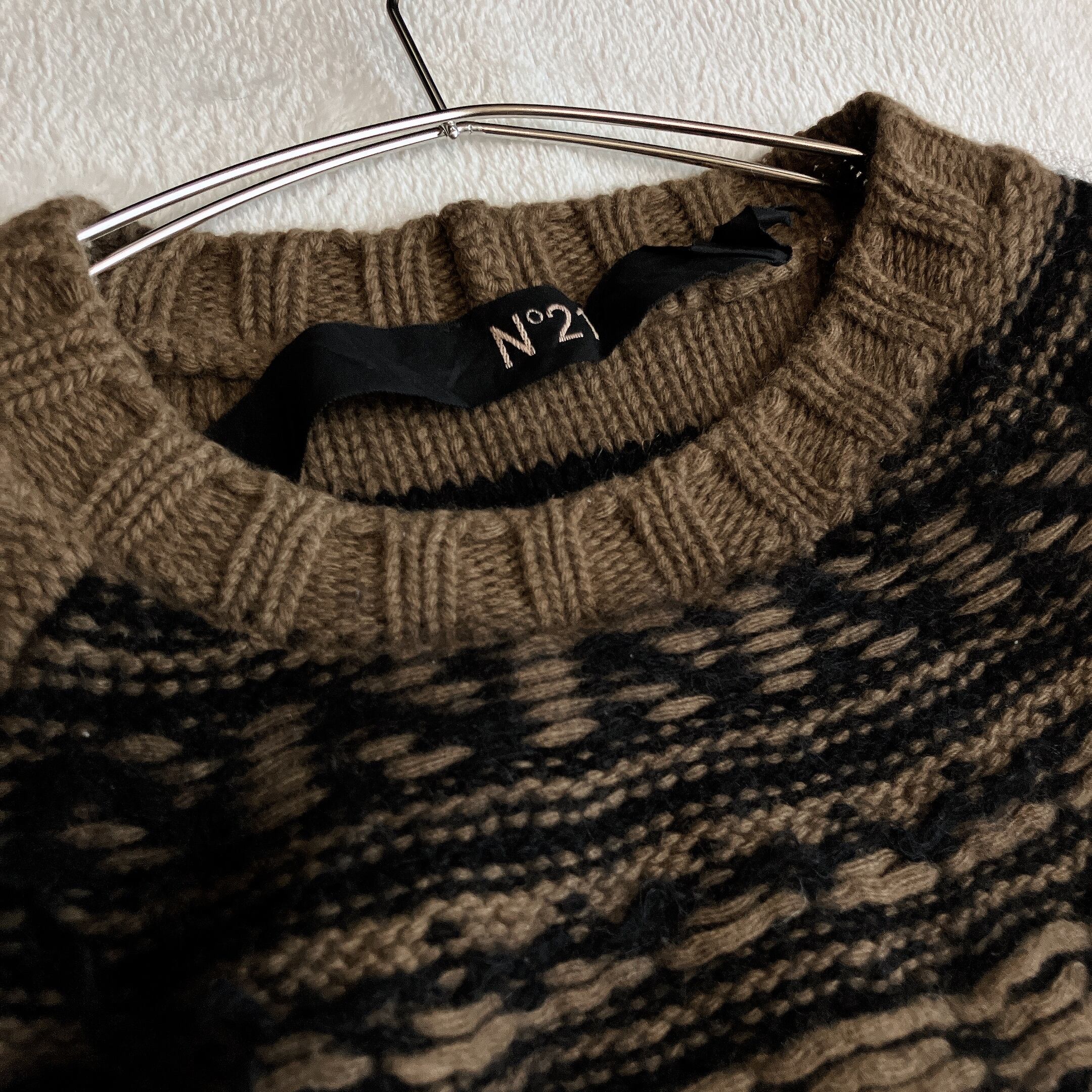ヌメロヴェントゥーノ N°21★モヘア ウール フリンジ ノルディック柄 ニット セーター ブラウン系×ブラック系