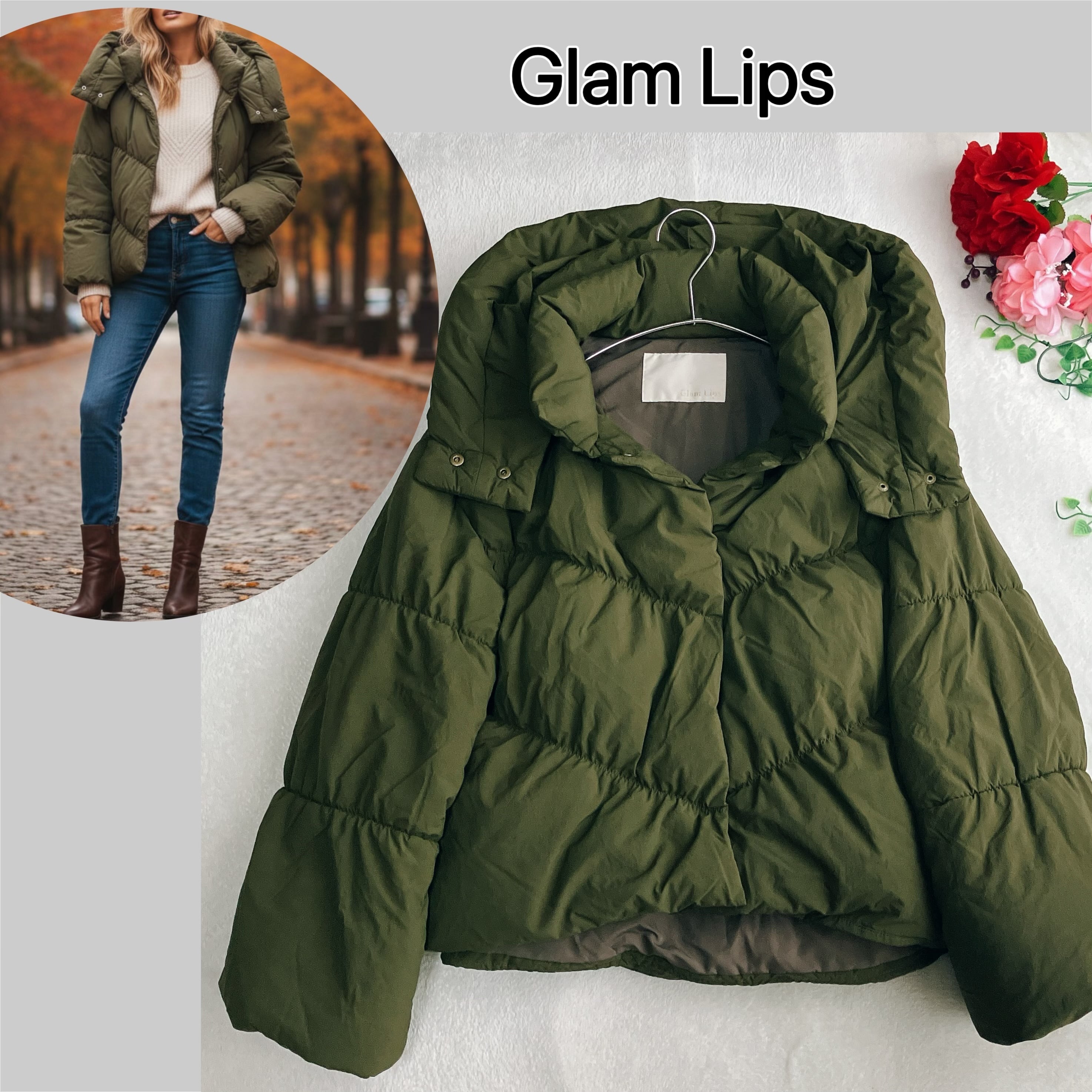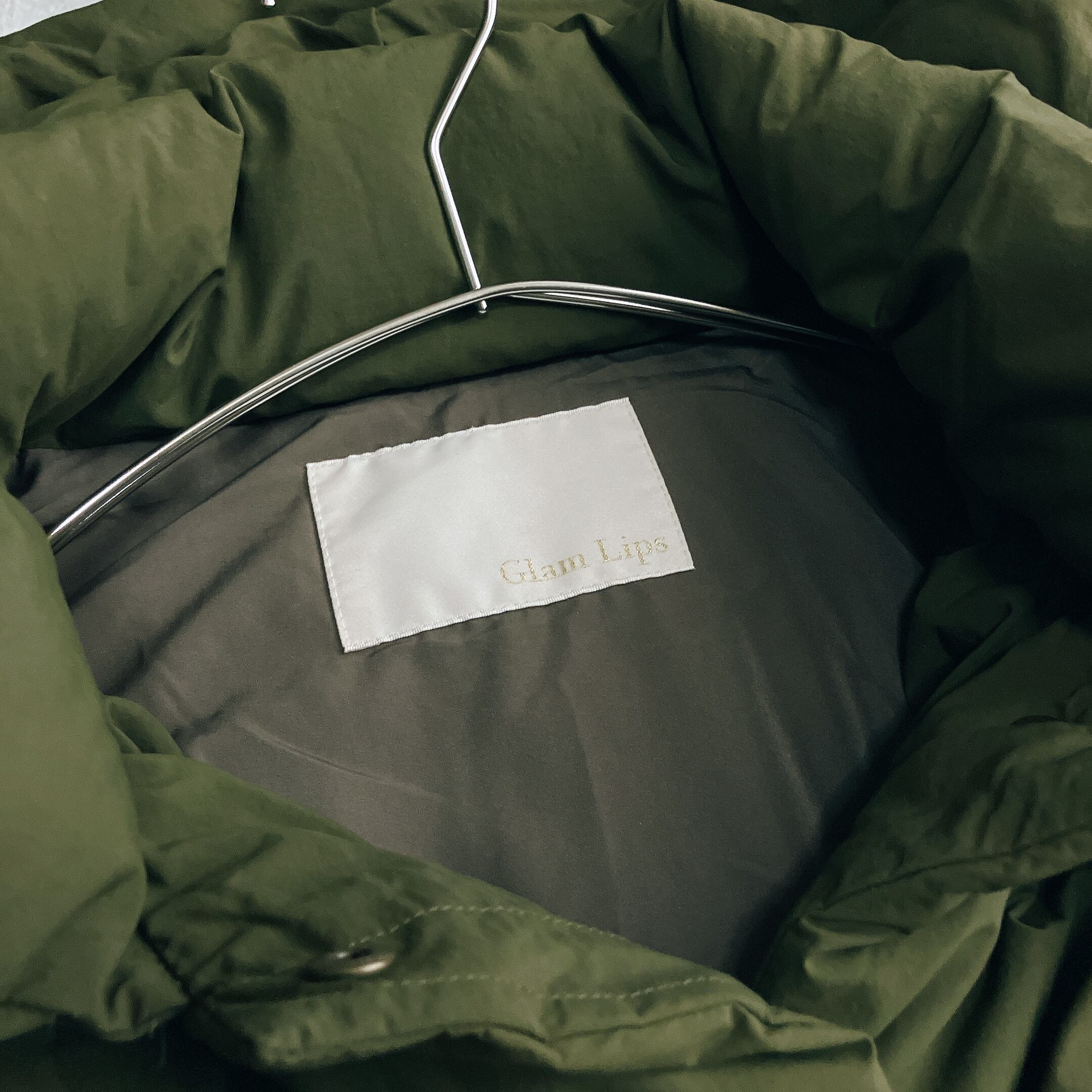 グラムリップス Glam Lips★2WAY ダウンジャケット ビッグシルエット ドロップショルダー フード付き カーキ系