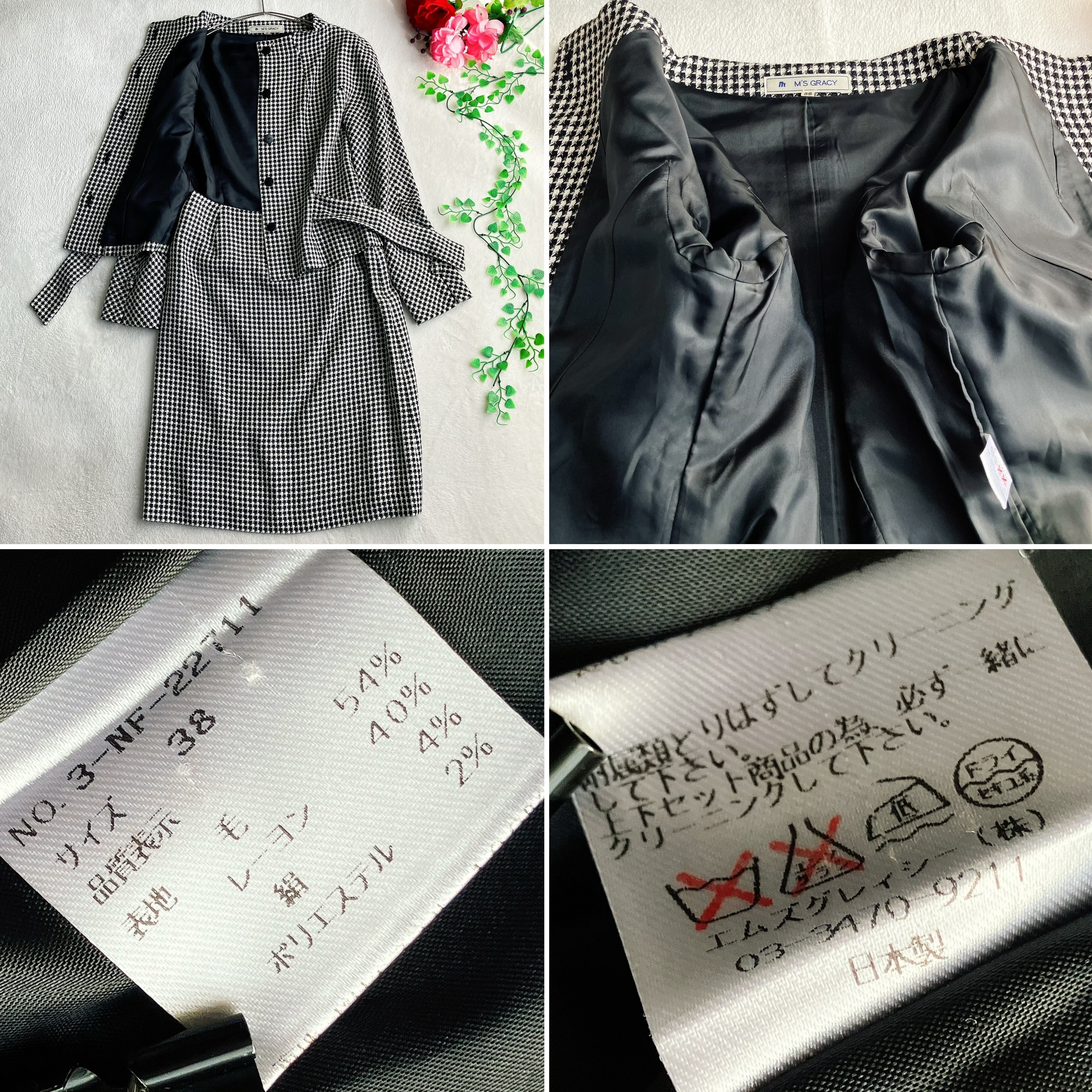 M'S GRACY エムズグレイシー★シルク ウール ツイード ノーカラー スカートスーツ 千鳥格子 比翼ボタン リボン セレモニー ブラック×ホワイト