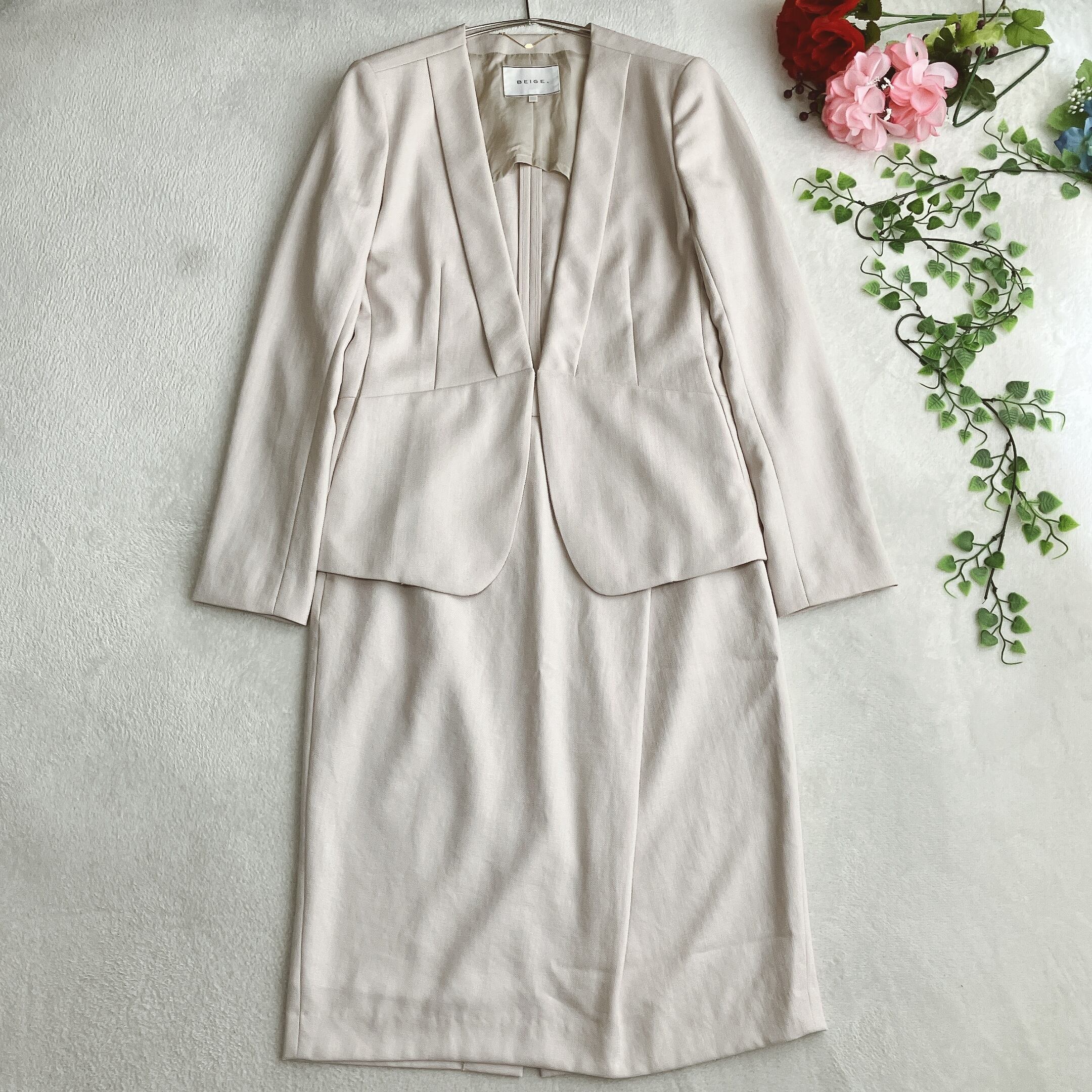 ベイジ BEIGE★ノーカラー スカートスーツ Vネック 背抜き バックスリット ライトベージュ系