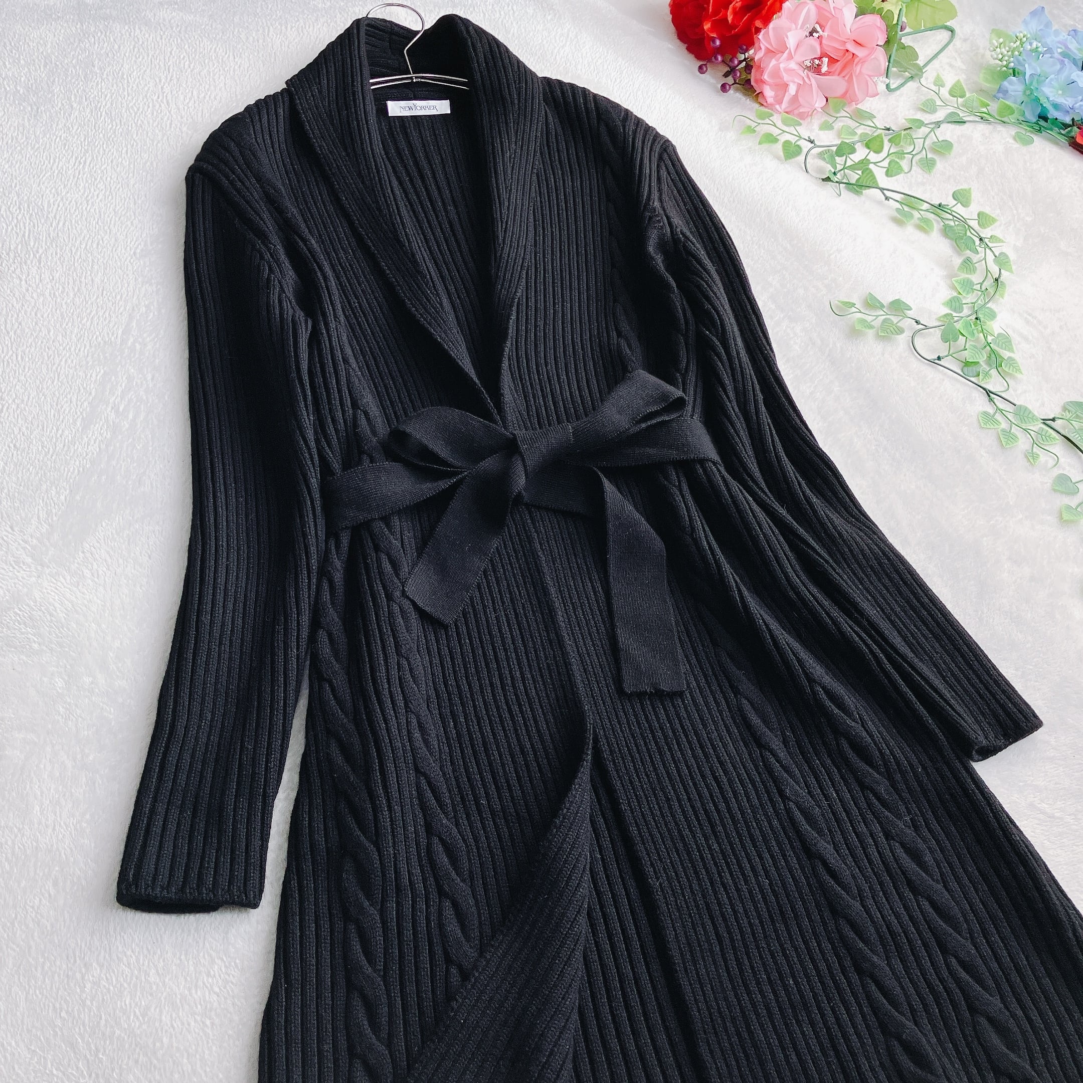 NEWYORKER ニューヨーカー★ショールカラー ロングコート ケーブルニット アウター リブ編み ドロップショルダー ブラック