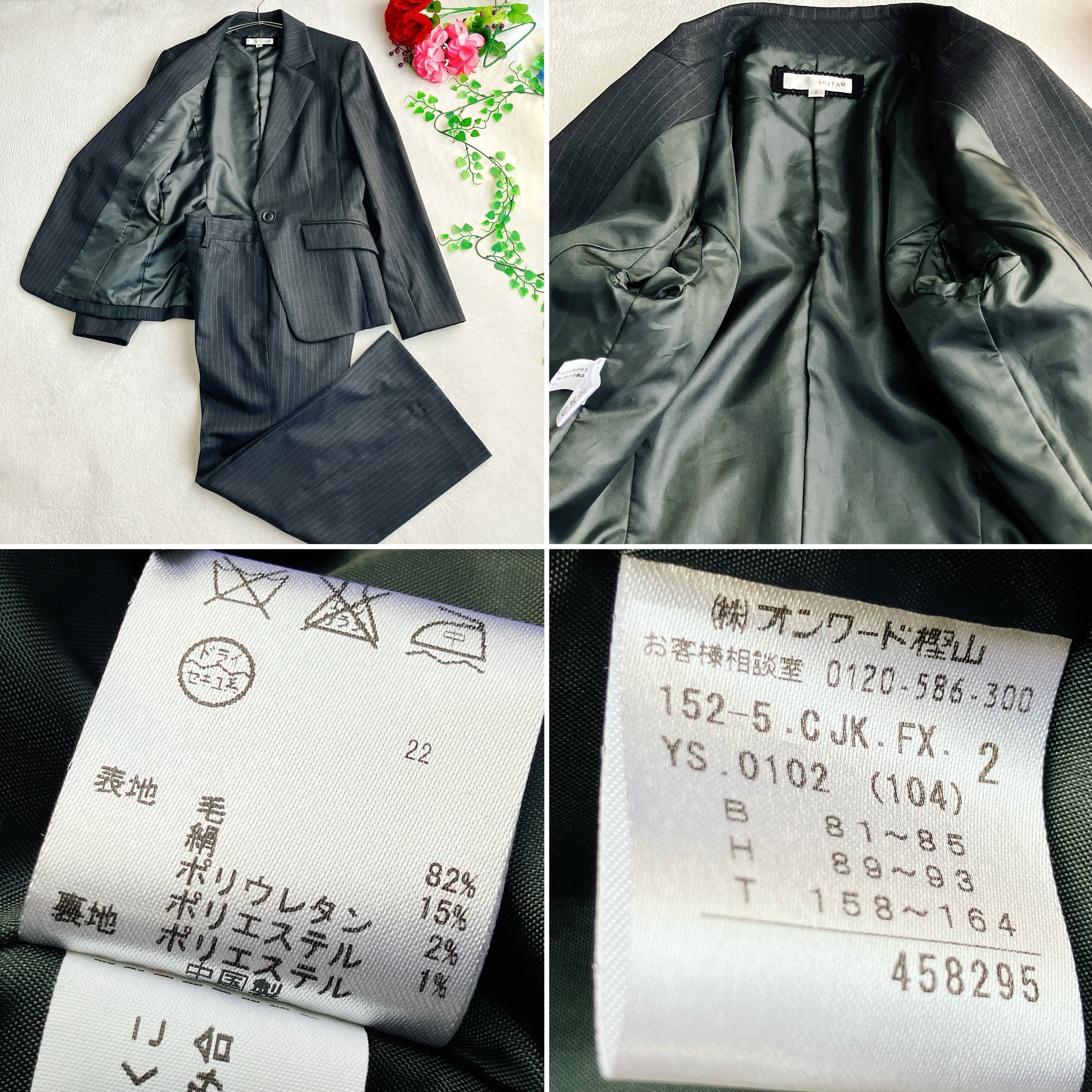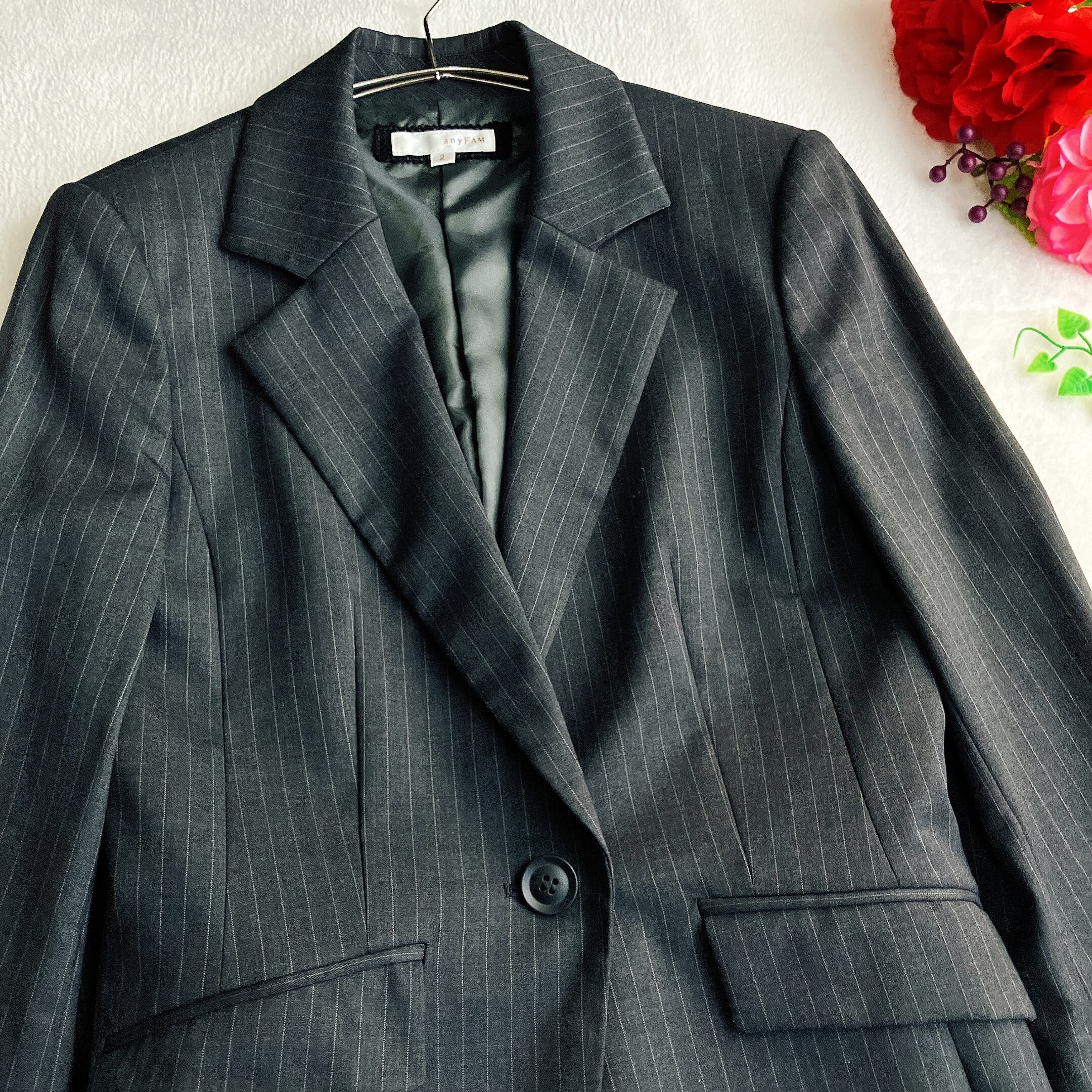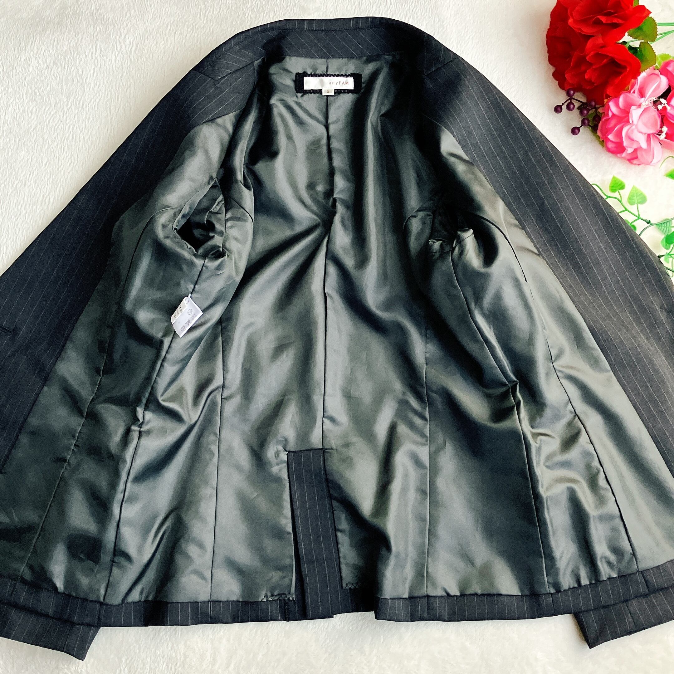 any FAM エニィファム オンワード★シルク ウール ストレッチ パンツスーツ ストライプ ワイドパンツ ダークグレー系