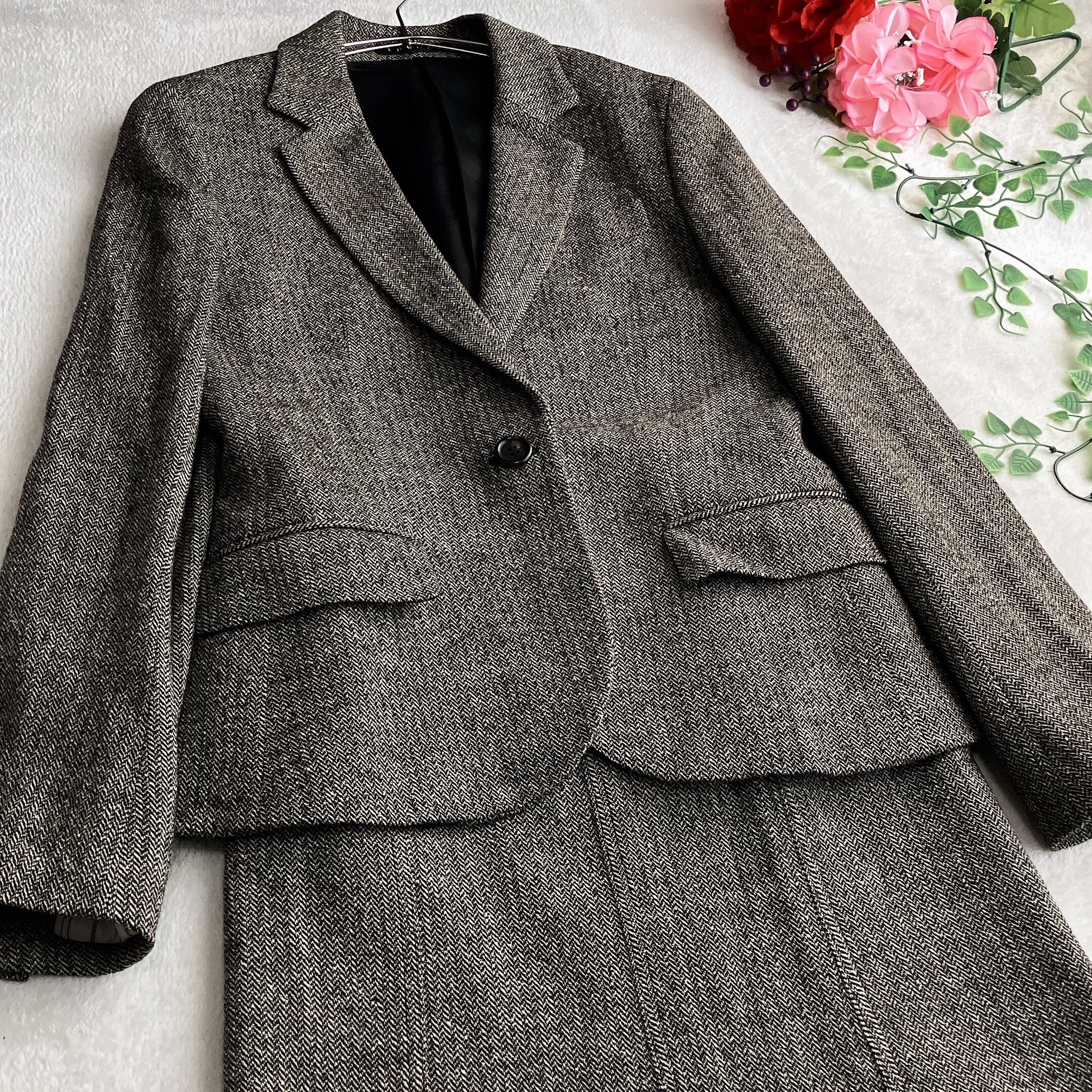 シルク混ウール素材を使用した、Theory(セオリー)ならではの高級感あるスカートスーツ。ヘリンボーン×ツイードのブラック×アイボリー配色が上品で、通勤・オフィス・フォーマル・セレモニーまで幅広く活躍します。