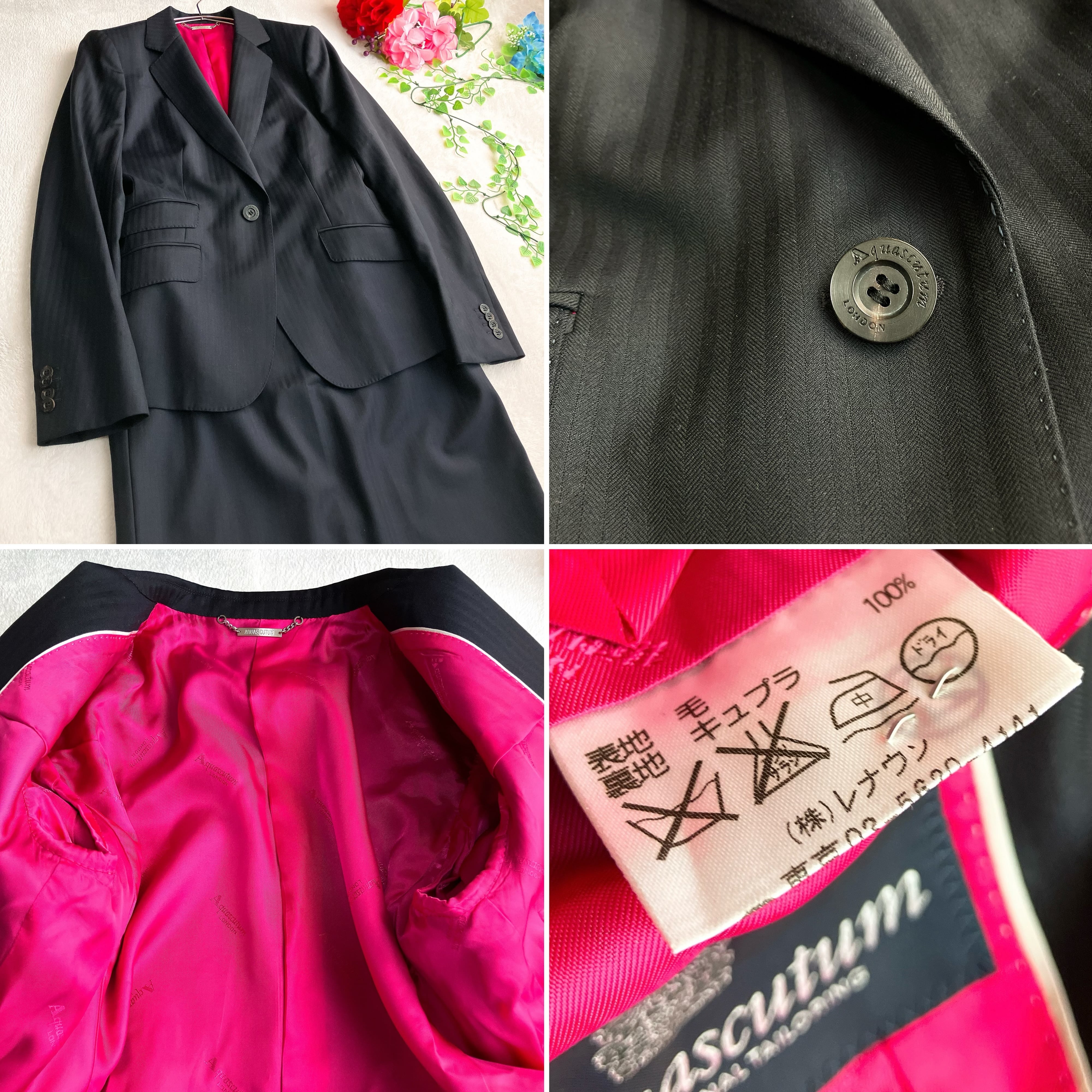 Aquascutum(アクアスキュータム)らしい上質ウール素材を使用したスカートスーツ。さりげないシャドウストライプがダークネイビーに奥行きを与え、ビジネススーツ・フォーマル・通勤まで幅広く活躍します。