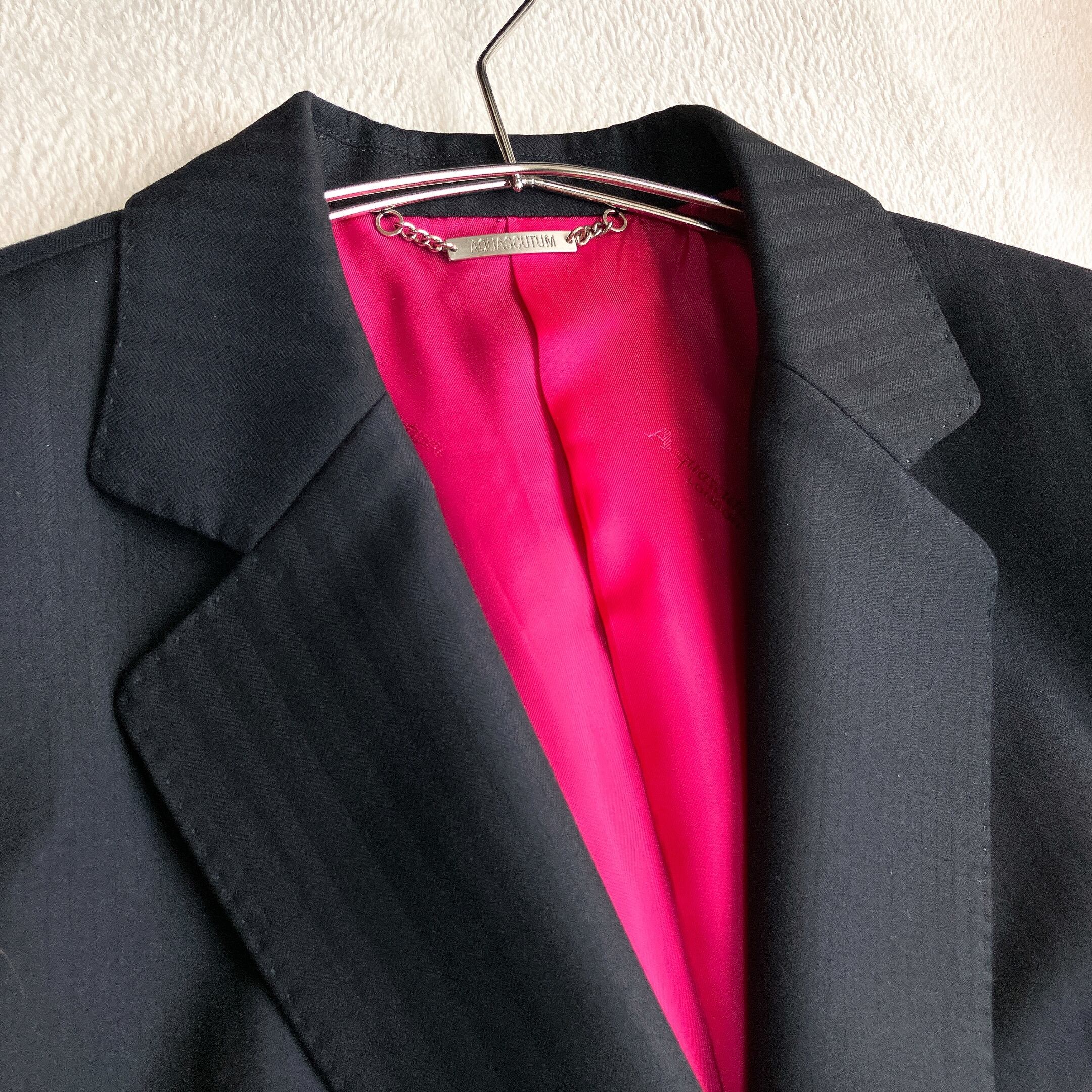 Aquascutum アクアスキュータム★シャドウストライプ スカートスーツ ロゴ総柄裏地 ウール ダークネイビー×ピンク系