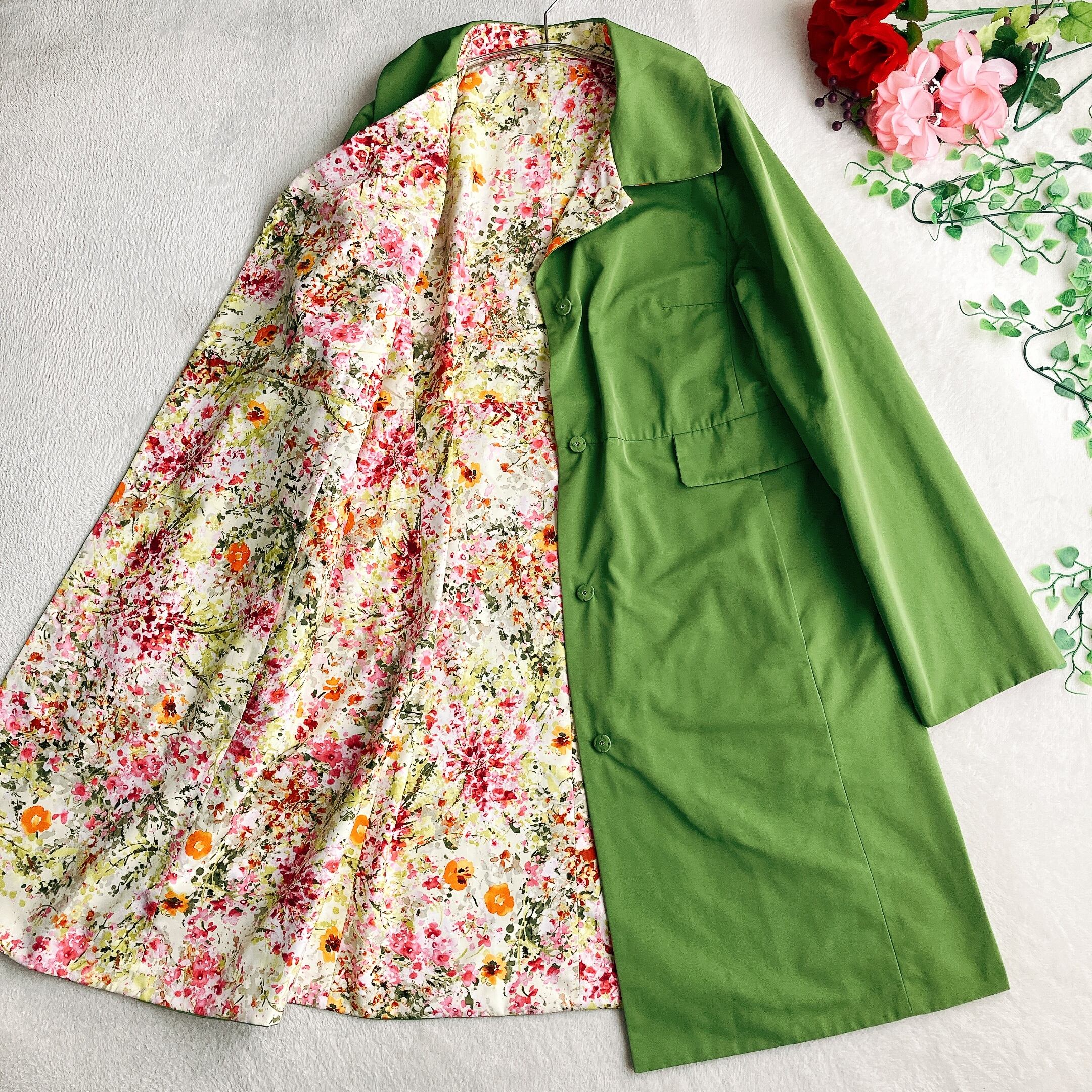 【美品】【2WAY】TO BE CHIC トゥービーシック★リバーシブル ステンカラーコート 花柄 総柄 Aライン グリーン系×マルチ
