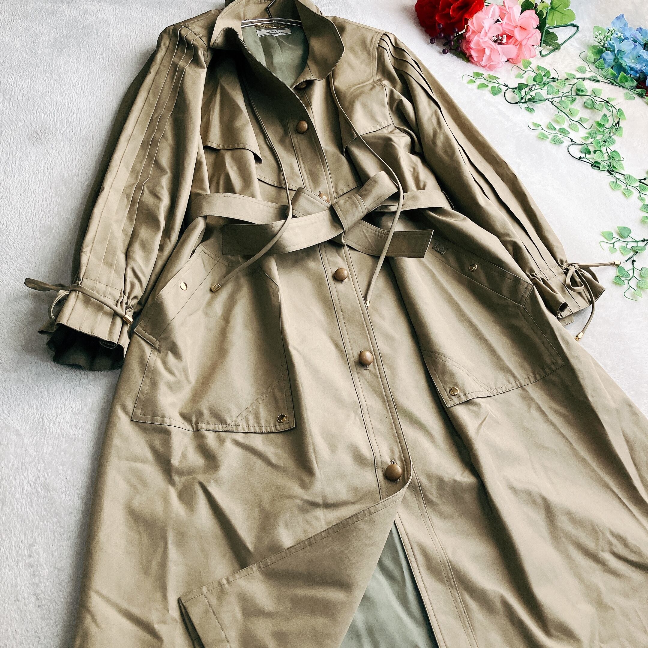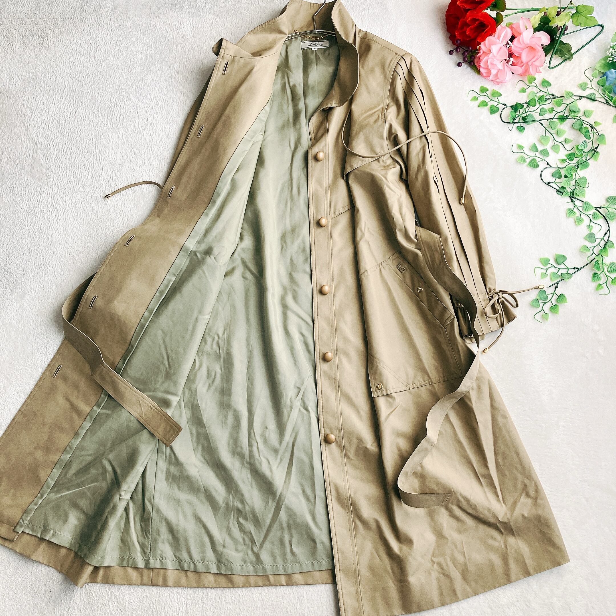 ウエストベルト付きなので、スタイルアップ効果も◎。ベージュ系カラーは流行に左右されず、長く愛用できる定番アイテム。百貨店ブランド・レリアンのスプリングコートをお探しの方にぴったりです。