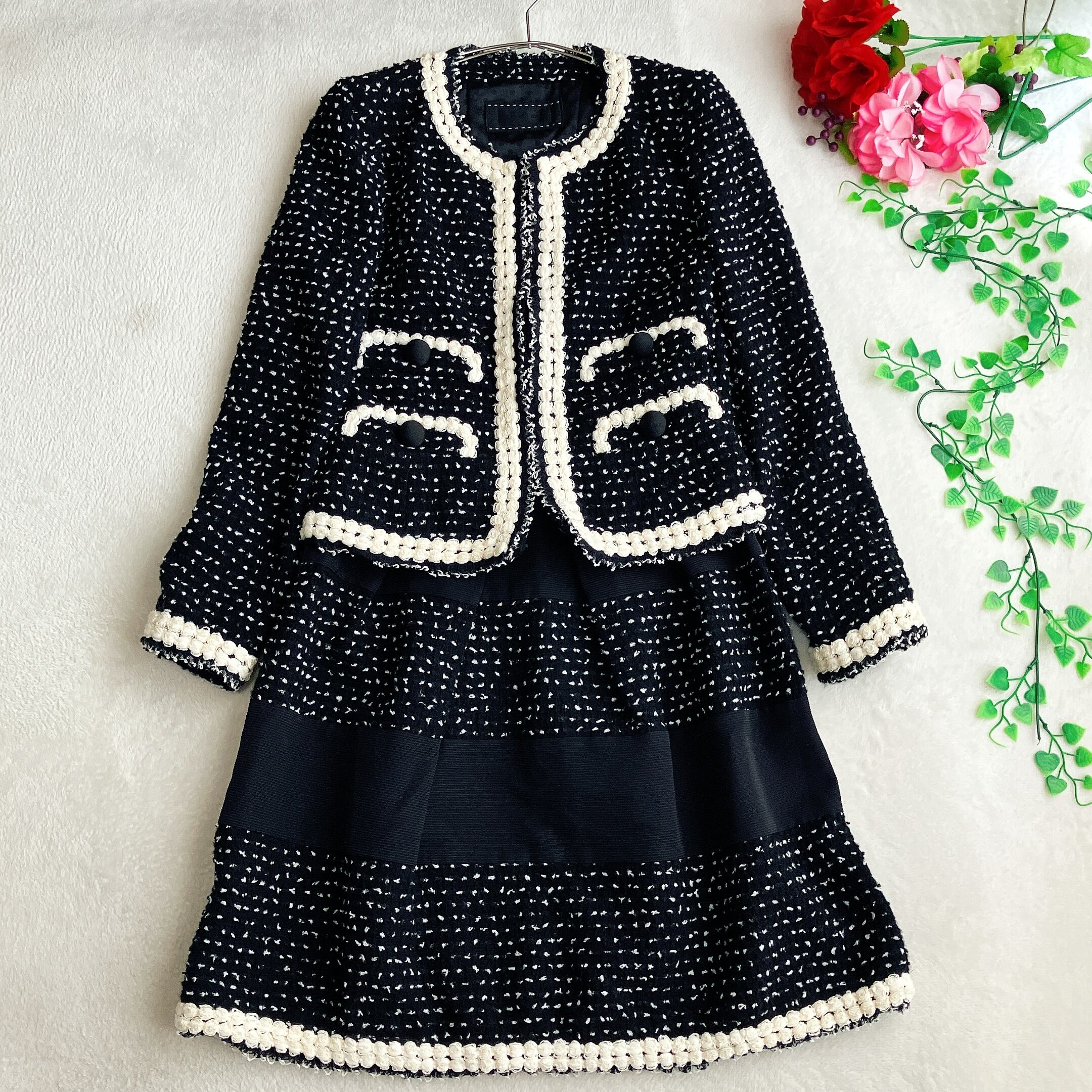 TO BE CHIC トゥービーシック★ツイード ノーカラー スカートスーツ フラワーパイピング フリル セレモニースーツ フレア ブラック×アイボリー