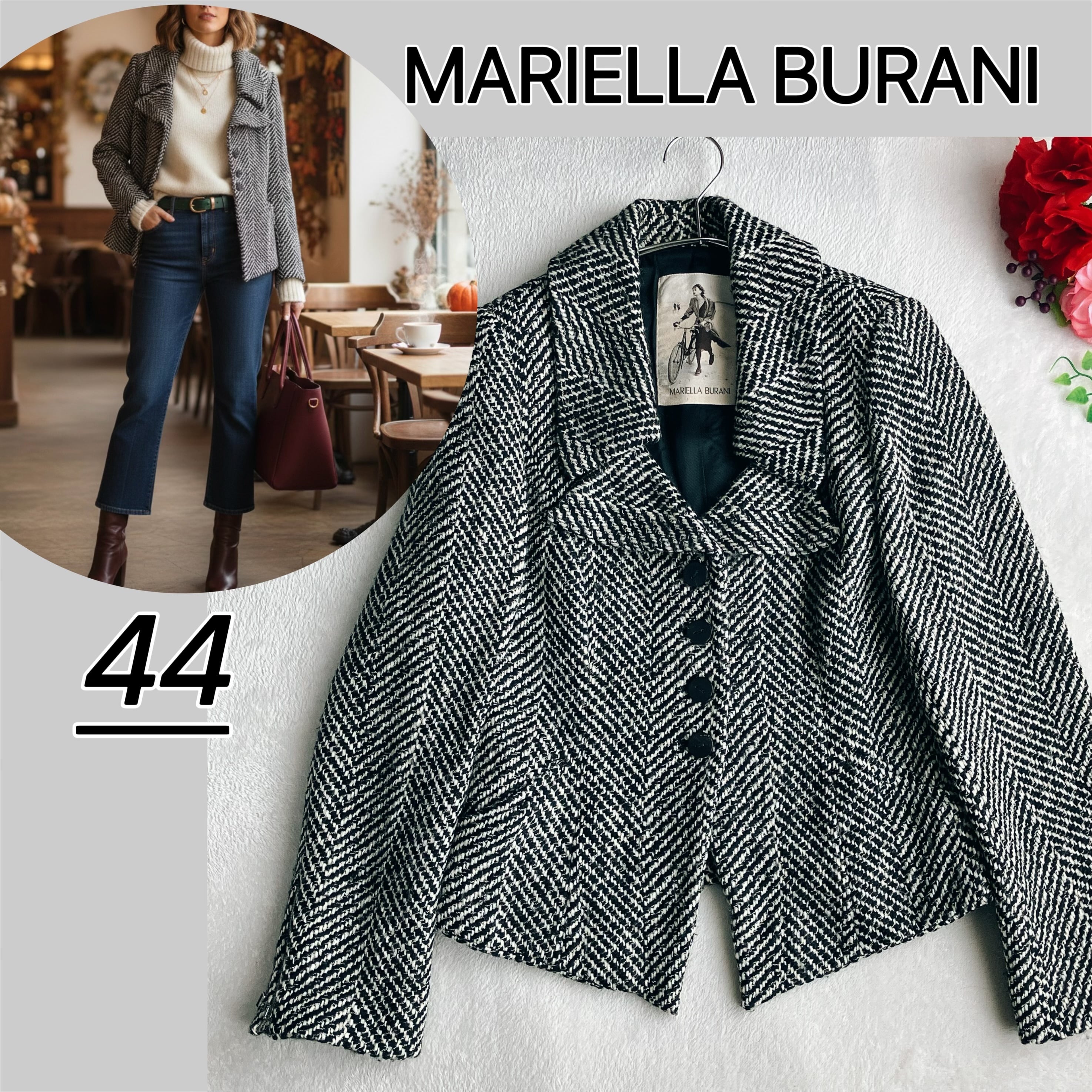 MARIELLA BURANI(マリエラブラーニ)らしい高級感のあるヘリンボーン柄ツイード。シルク混ウール素材で、見た目にも風合いにも品があり、秋冬コーデを格上げしてくれる一着です。ブラック×アイボリー配色で着回し力も◎。