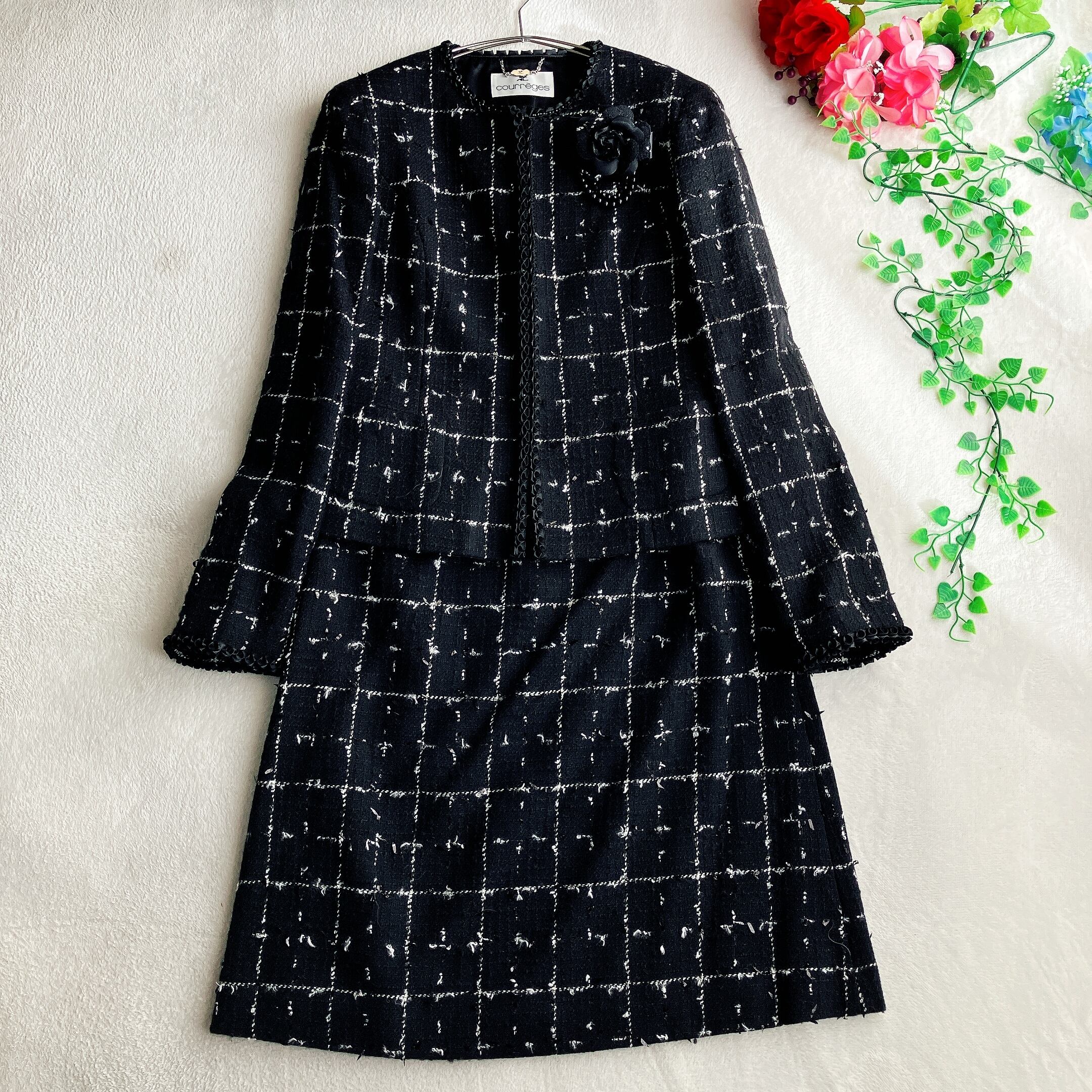 courreges クレージュ★コサージュ付 ツイード ノーカラー スカートスーツ フラワーパイピング ビーズ ウール Aライン セレモニー ブラック×ホワイト