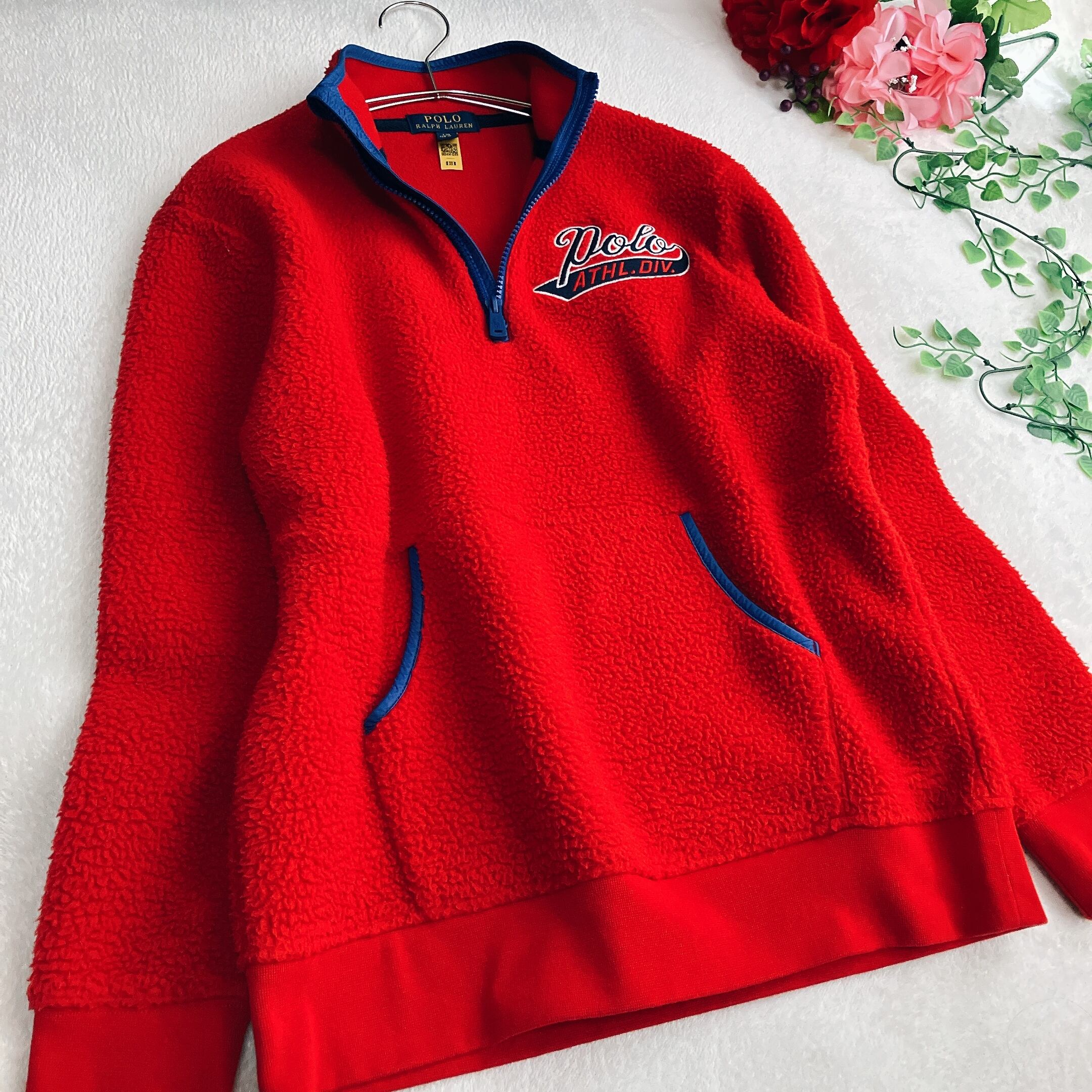 【現行QRタグ】【美品】【洗える】 POLO RALPH LAUREN ポロラルフローレン★ハーフジップ ボアフリース プルオーバー デカロゴ ヴィンテージデザイン レッド×ブルー