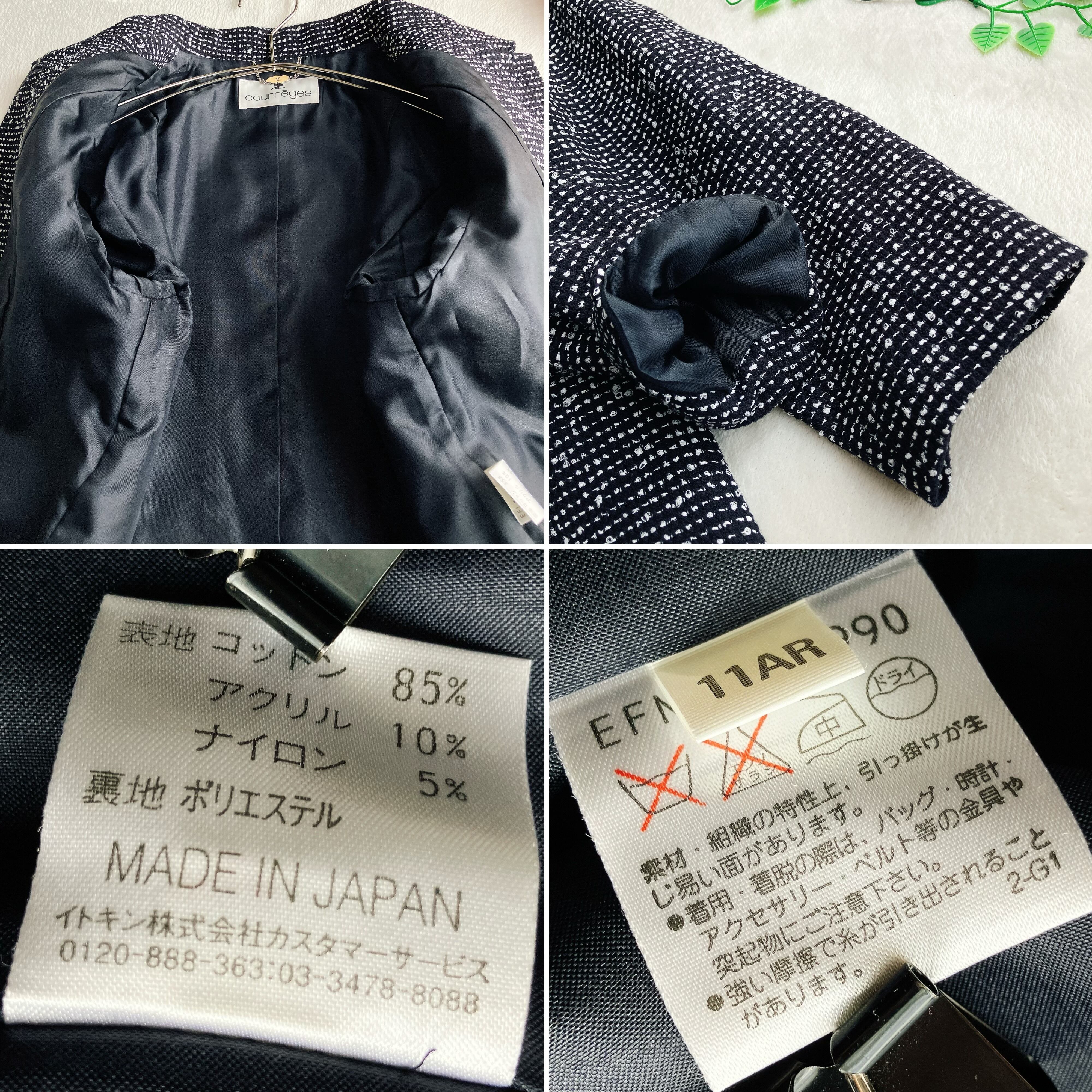 フロントにはクレージュ ロゴボタンを使用し、さりげなく高級感を演出。シンプルながらもブランドの存在感があり、セレモニースーツ・フォーマルスーツ・ワンピーススーツをお探しの方におすすめです。
