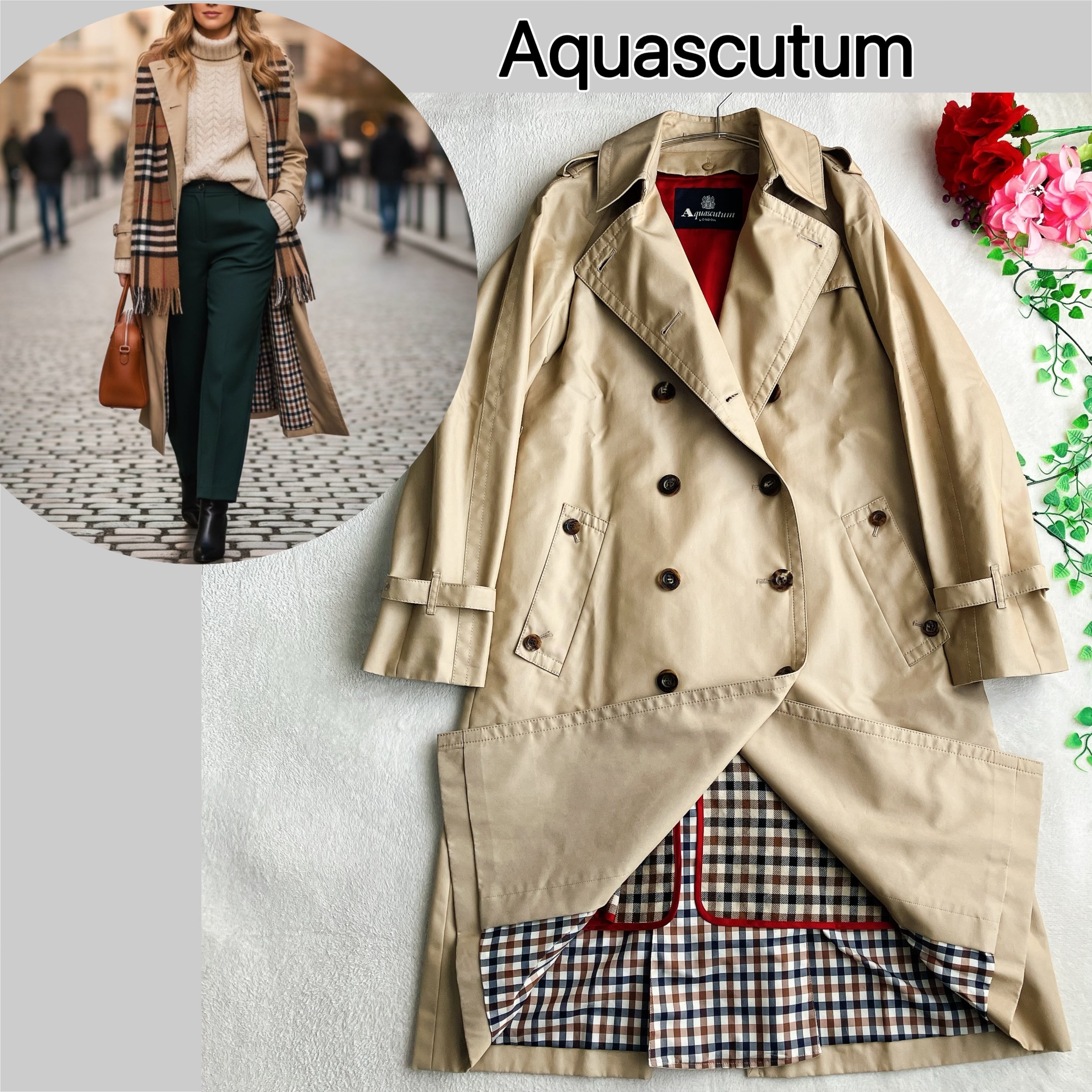 裏地にはアクアスキュータムを象徴するクラブチェック柄を採用。ダブル仕様×Aラインシルエットで、ベージュ系のトレンチコートながら女性らしくエレガントな印象に仕上がります。
