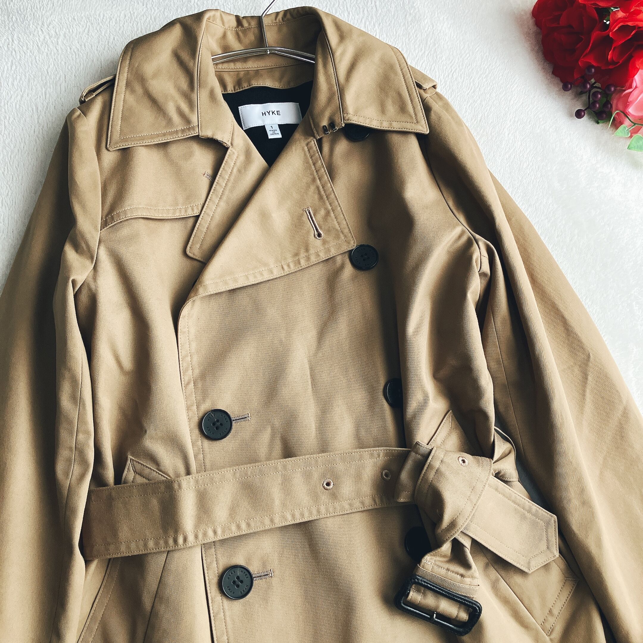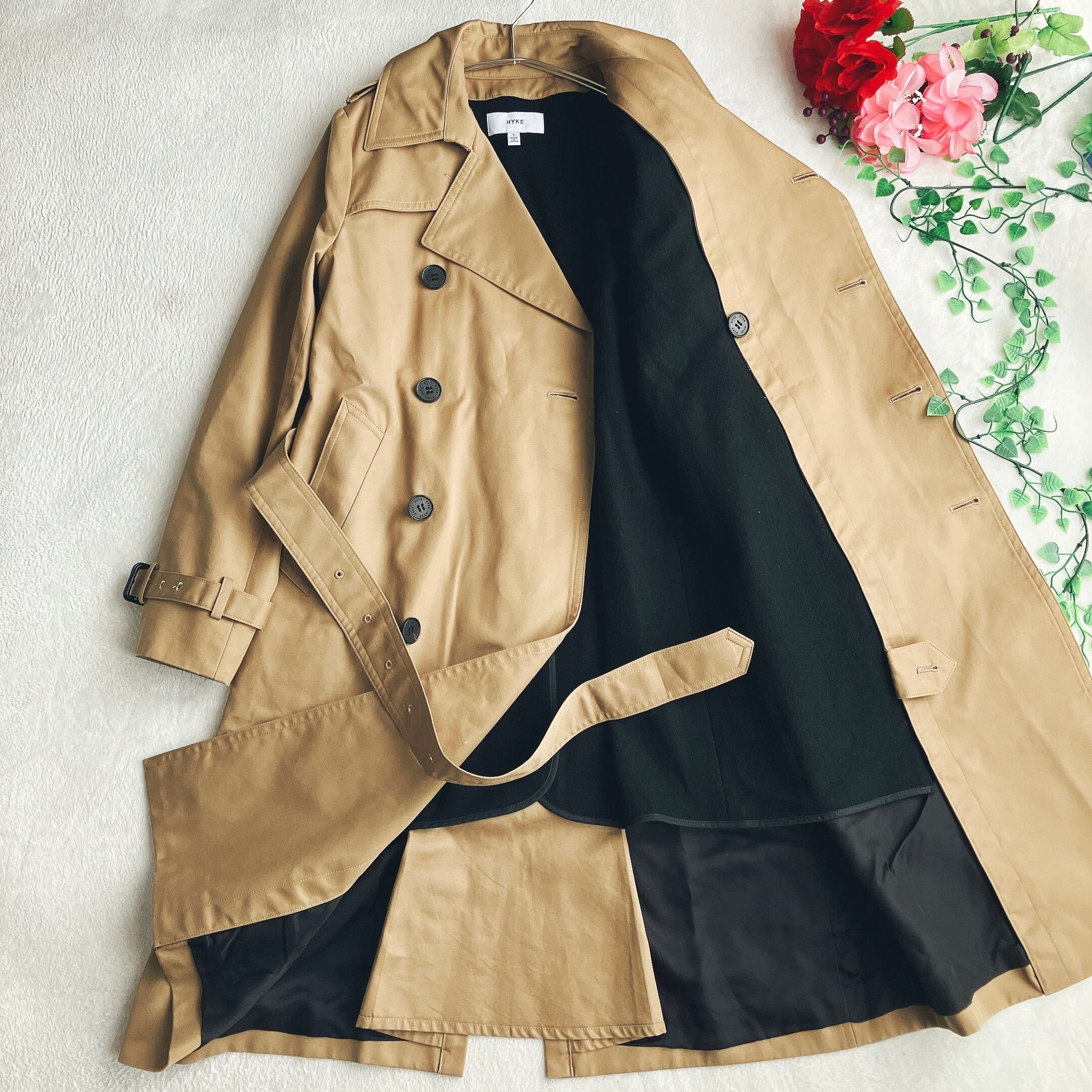トレンチコート王道のベージュ系カラーは、流行に左右されず長く愛用可能。HYKEならではの上質素材とミニマルなデザインで、セレクト系・大人ナチュラル・モード好きの方にも高評価の一着です。