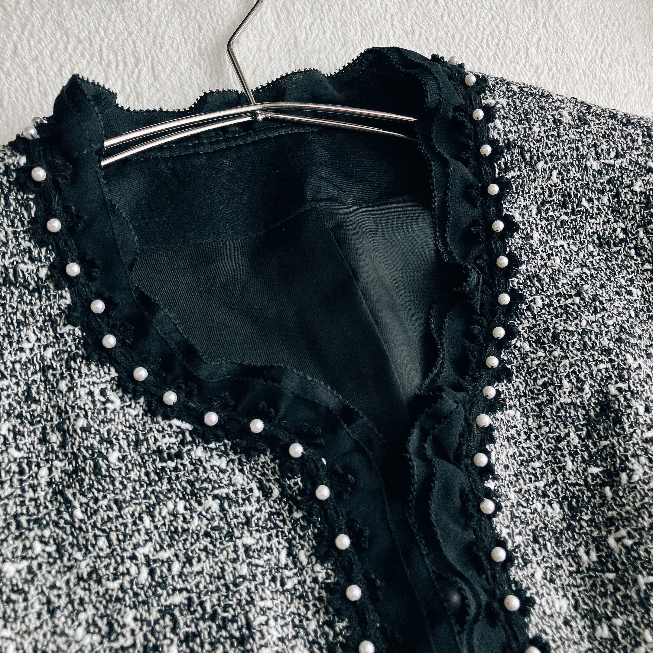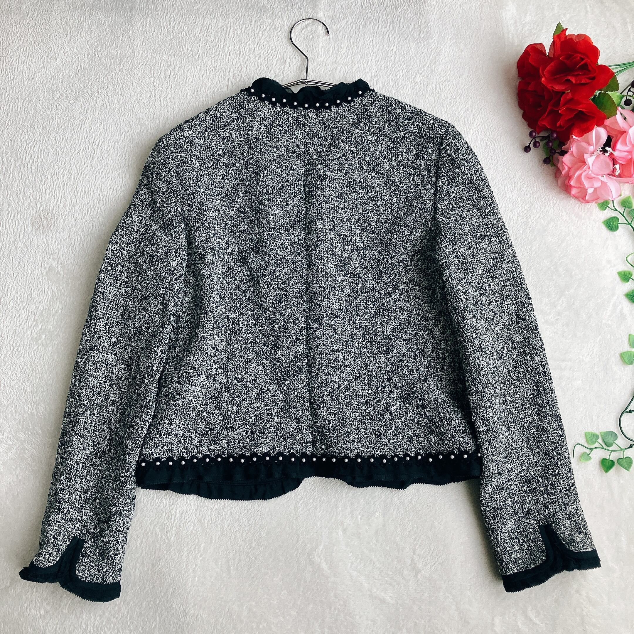 Leilian(レリアン)らしい上質なツイード素材を使用したノーカラージャケット。ブラック×アイボリー系のミックスカラーが高級感を演出します。フロントと裾にあしらわれたパール装飾とピコフリルが華やかさをプラスし、セレモニージャケットとしても映える一着です。