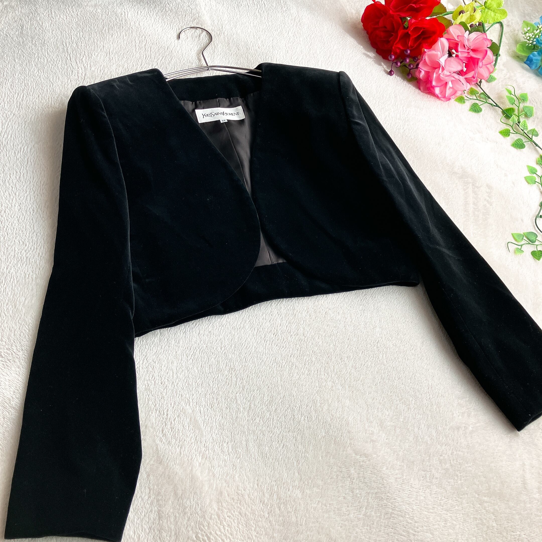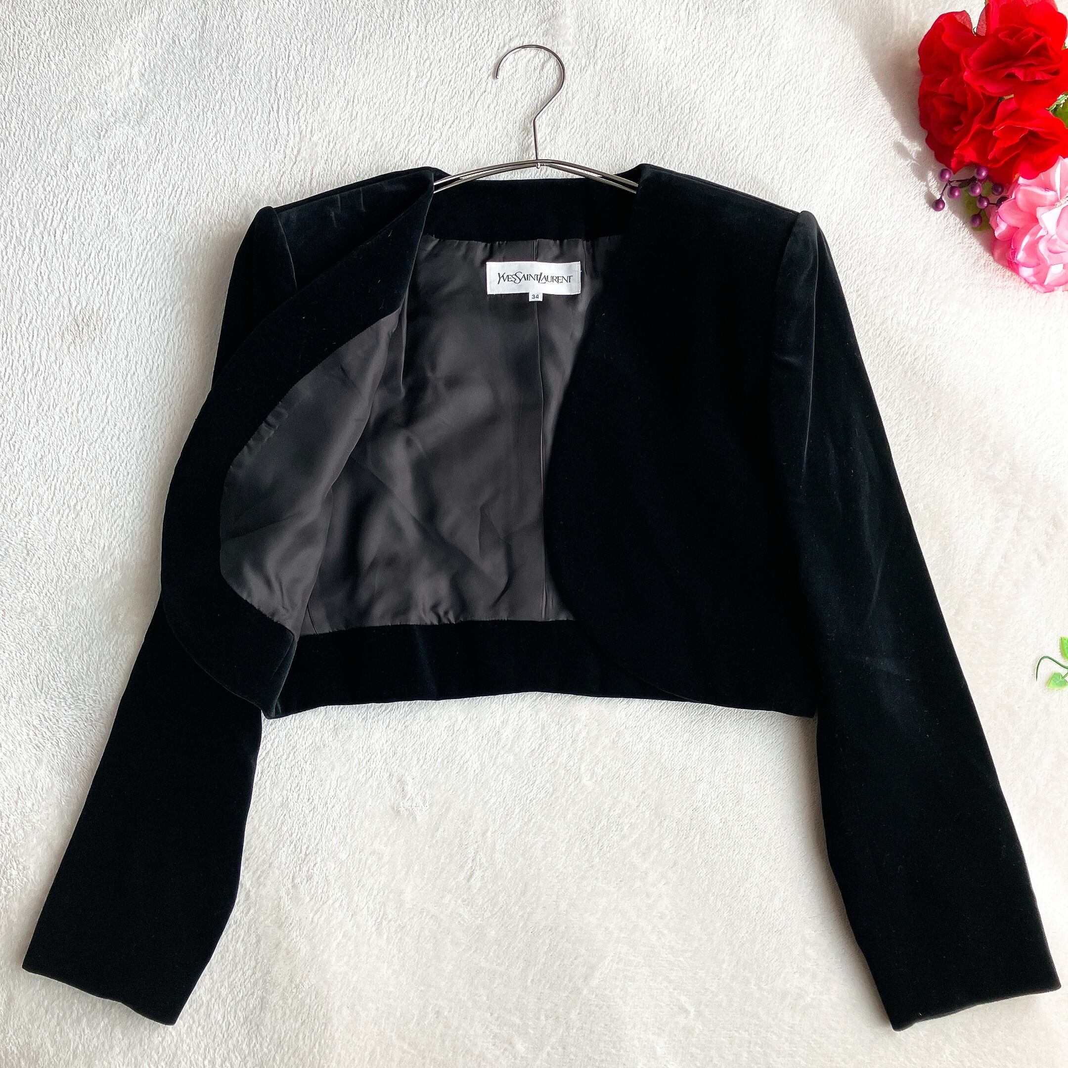 Yves Saint Laurent イヴサンローラン★ベロア ノーカラージャケット ボレロ セレモニー 肩パッド ブラック系
