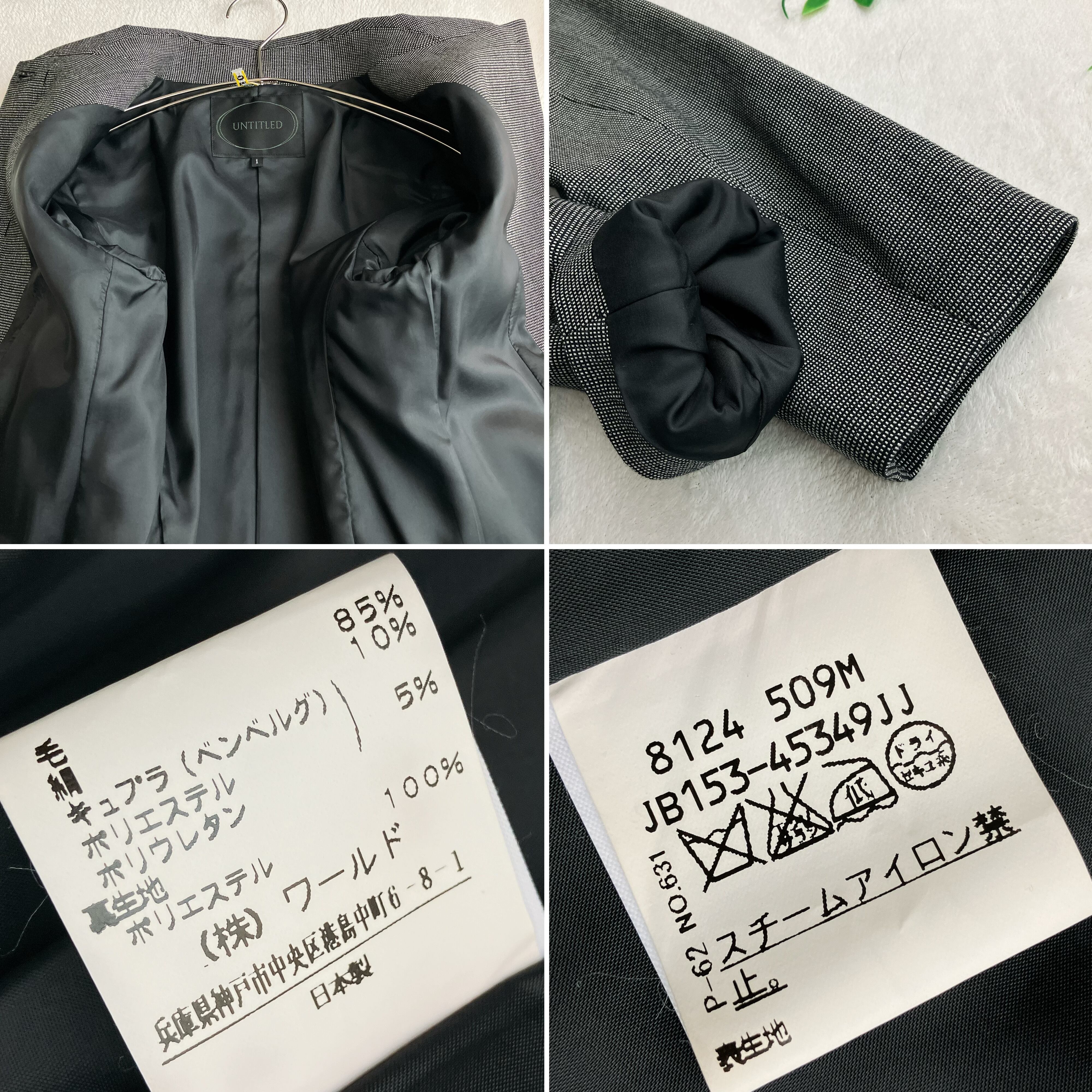 UNTITLED(アンタイトル)のシルク混ウール素材を使用したワンピーススーツ。上品な光沢感としなやかな肌触りが魅力です。バーズアイ柄にさりげないラメが織り込まれ、ブラック×ホワイトの上品な配色で入学式・卒業式・七五三・お受験・学校行事などのセレモニーシーンに最適です。
