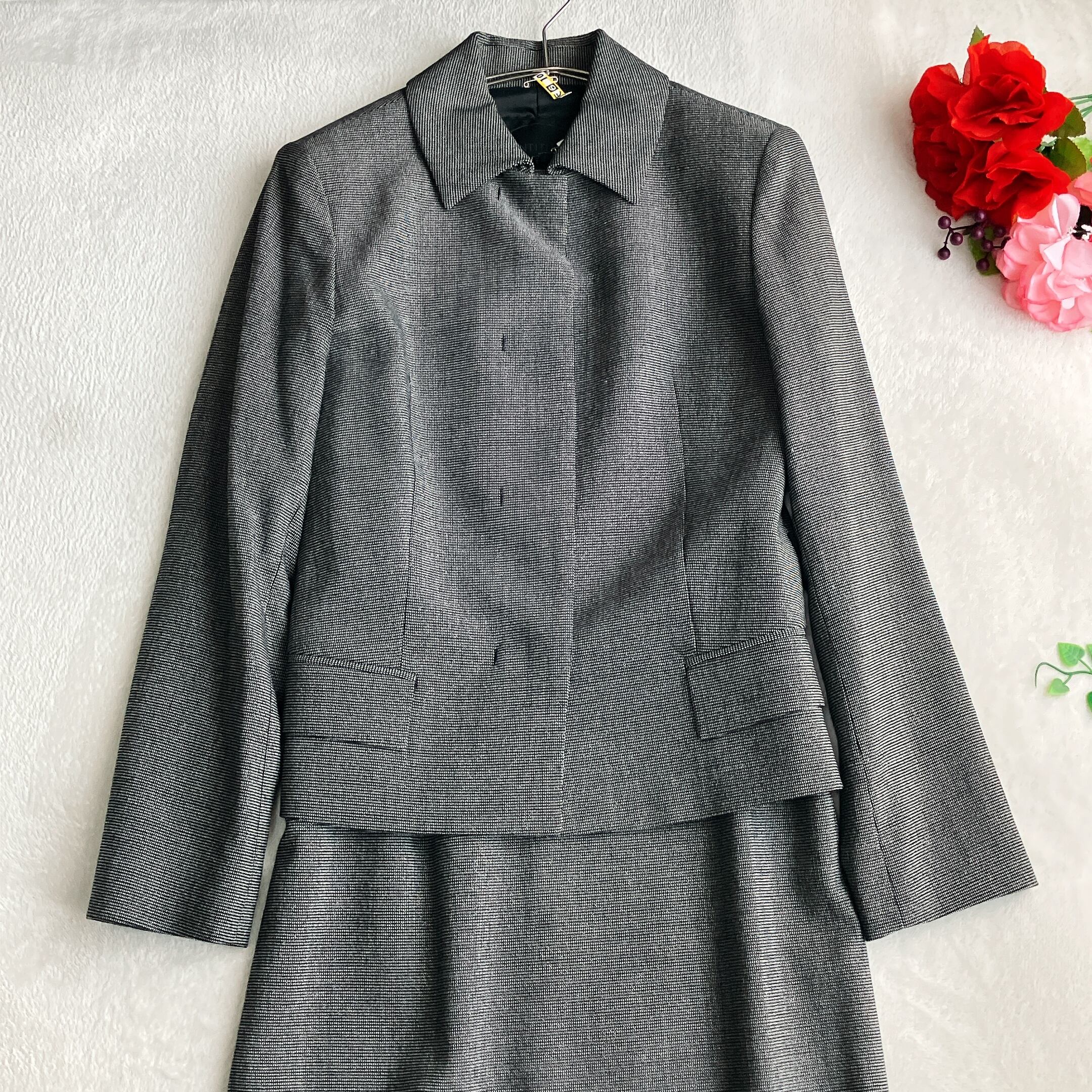 細やかなバーズアイ柄にラメのきらめきが加わり、シンプルながらも華やかな印象に。ブラック系セレモニースーツをお探しの方や、上質素材のワンピースセットアップをお求めの方におすすめ。アンタイトルらしいきちんと感と女性らしさを兼ね備えた一着です。