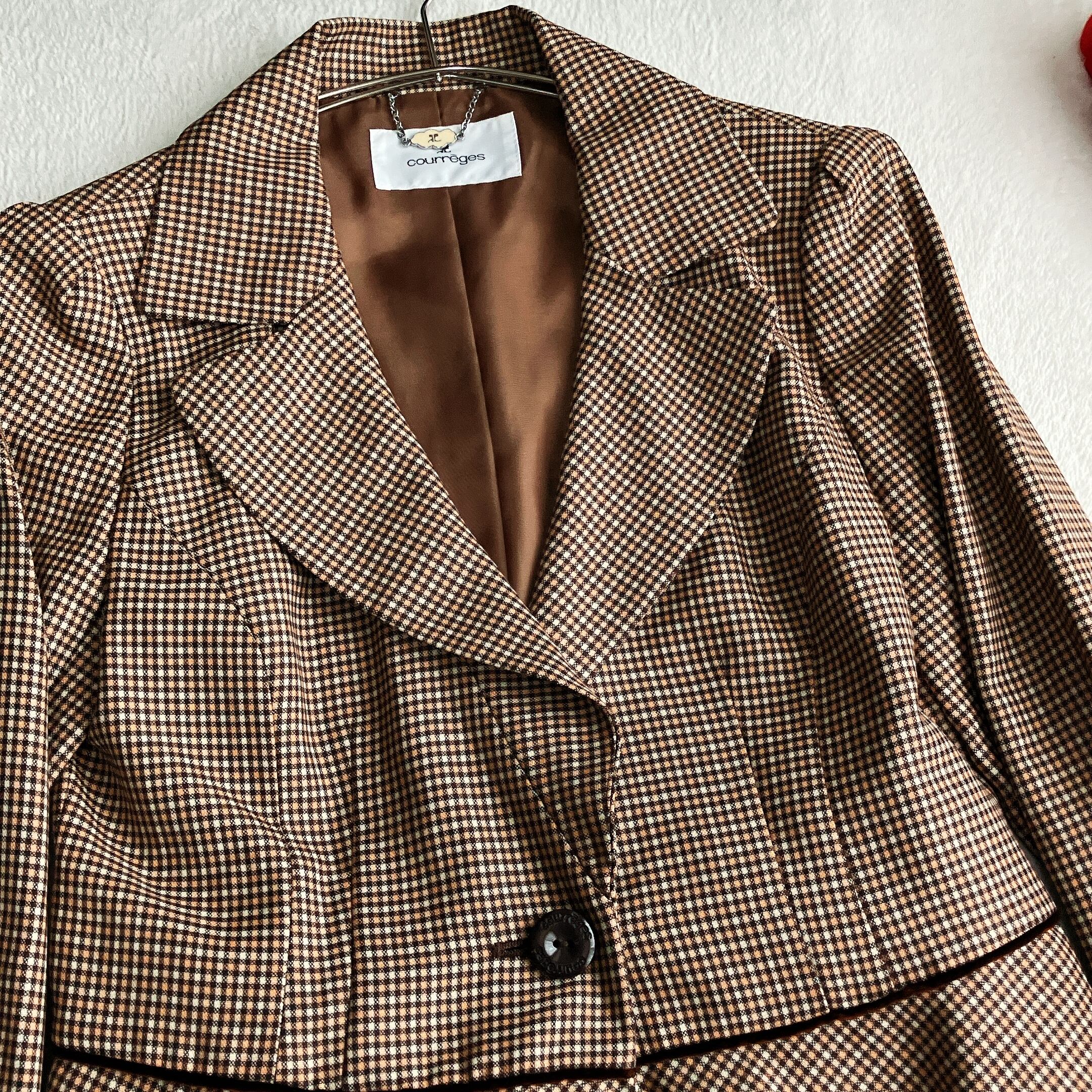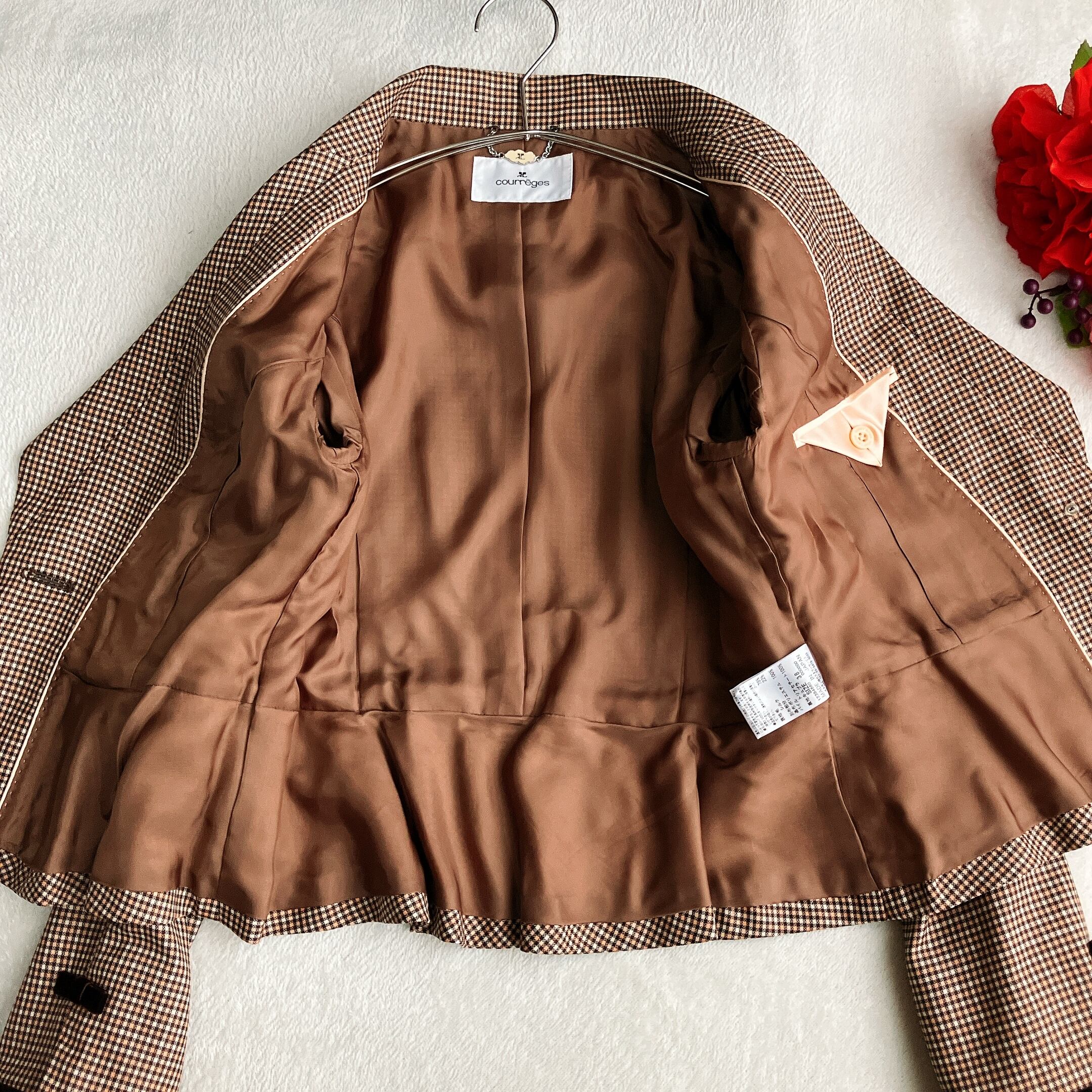 【極美品】courreges クレージュ★シルク ウール スカートスーツ ペプラム リボン チェック ベロア フリル Aライン セレモニー ブラウン系