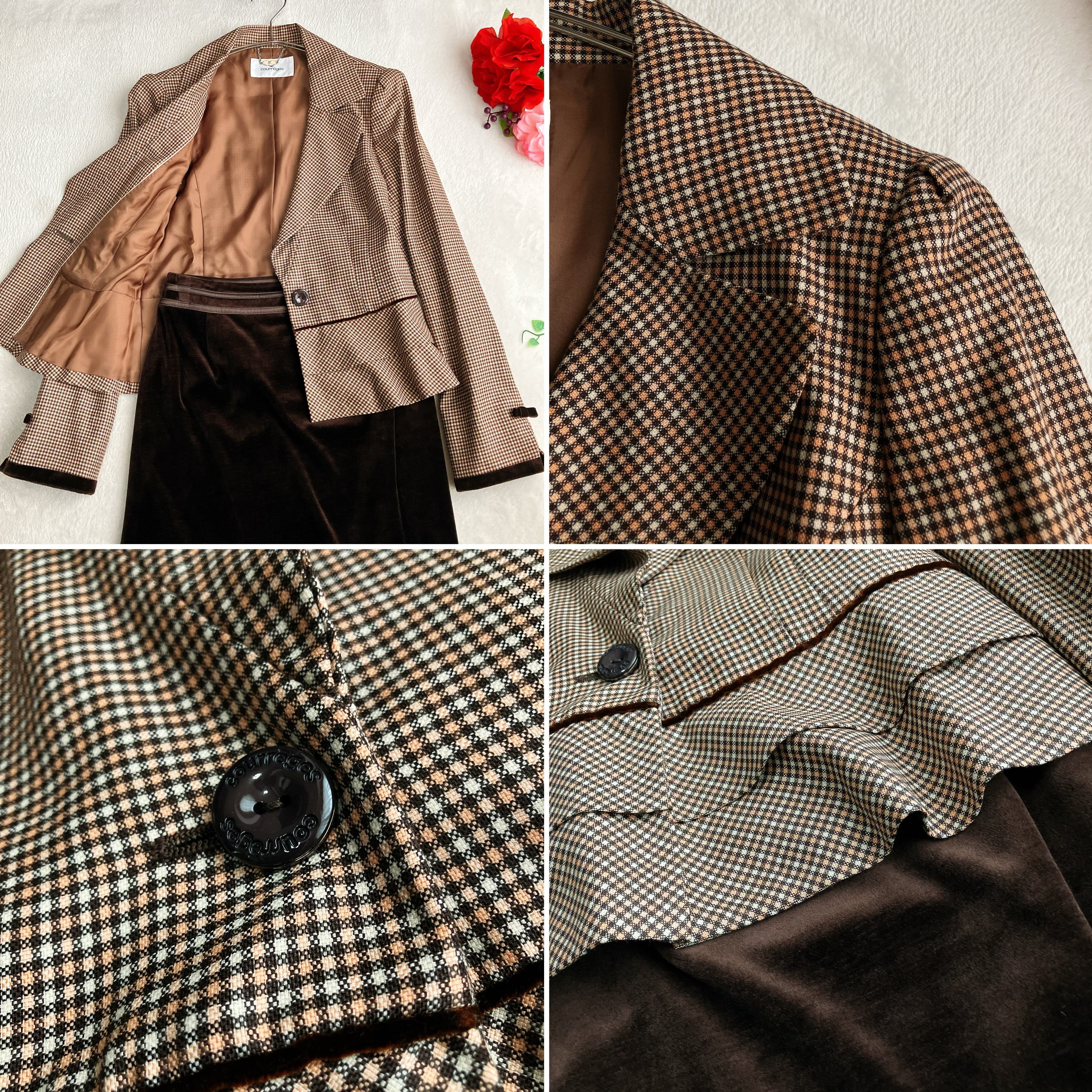 courreges クレージュ★シルク ウール スカートスーツ ペプラム リボン チェック ベロア フリル Aライン セレモニー ブラウン系×マルチ