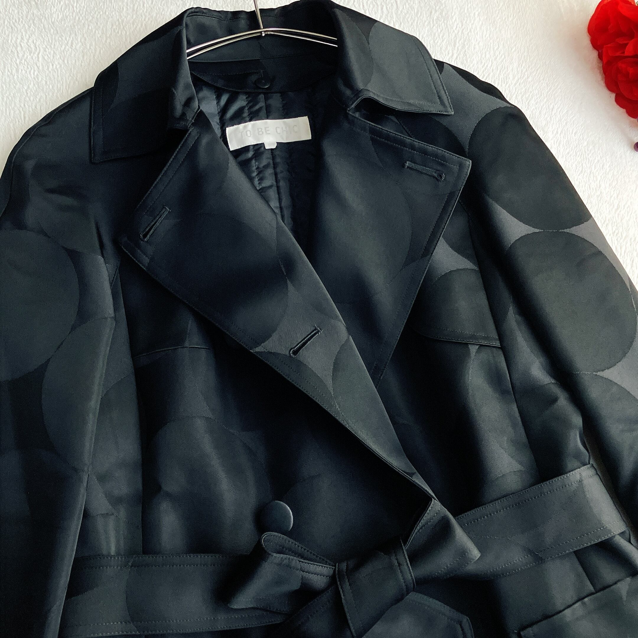 TO BE CHIC トゥービーシック★中綿ライナー付き ジャガード ドット 総柄 トレンチコート ダブル Aライン ベルト付き ブラック