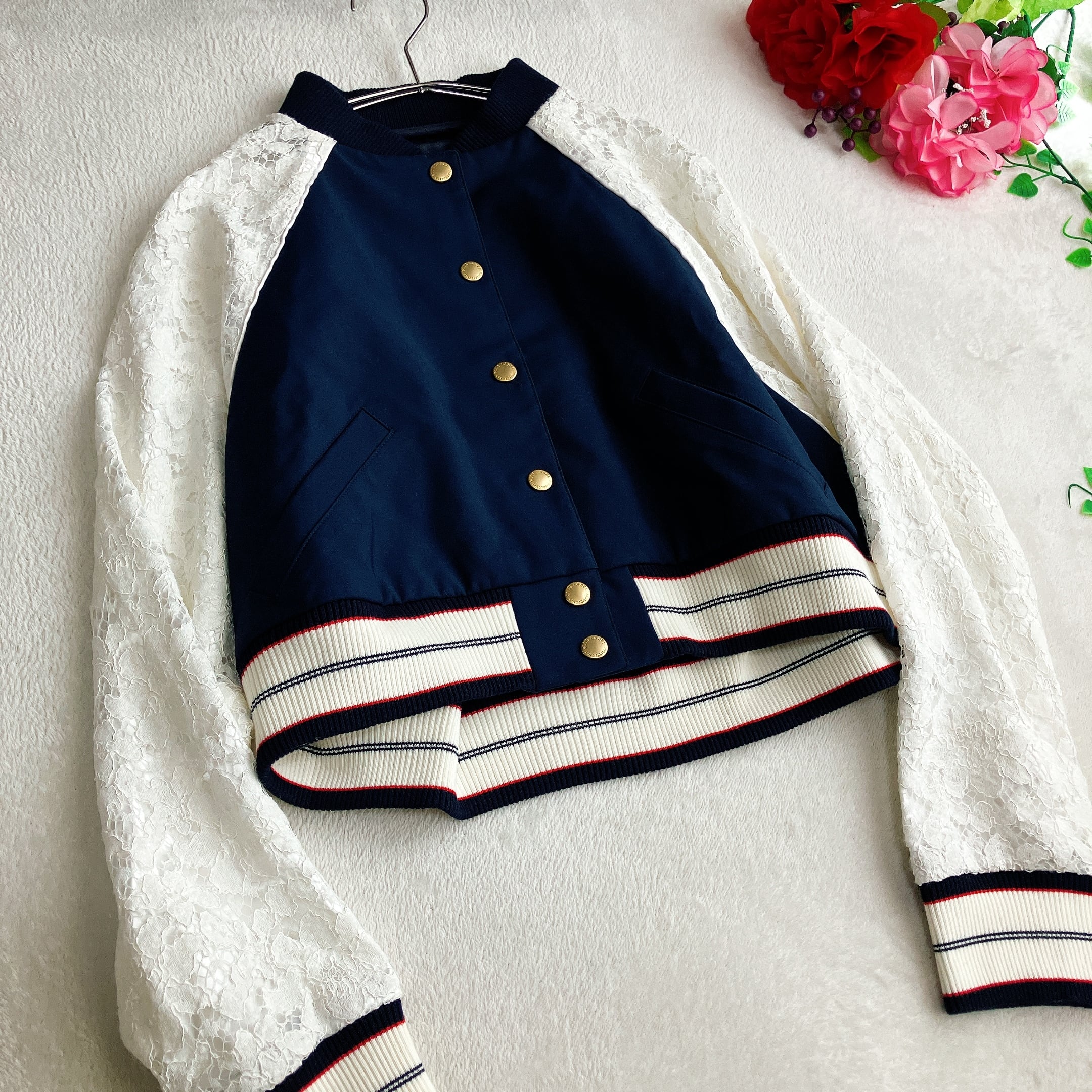 BLUE LABEL CRESTBRIDGE ブルーレーベルクレストブリッジ★異素材切替え ドルマンスリーブ ブルゾン スタジャン 花柄 レース 金ボタン ロゴ裏地 ネイビー×ホワイト