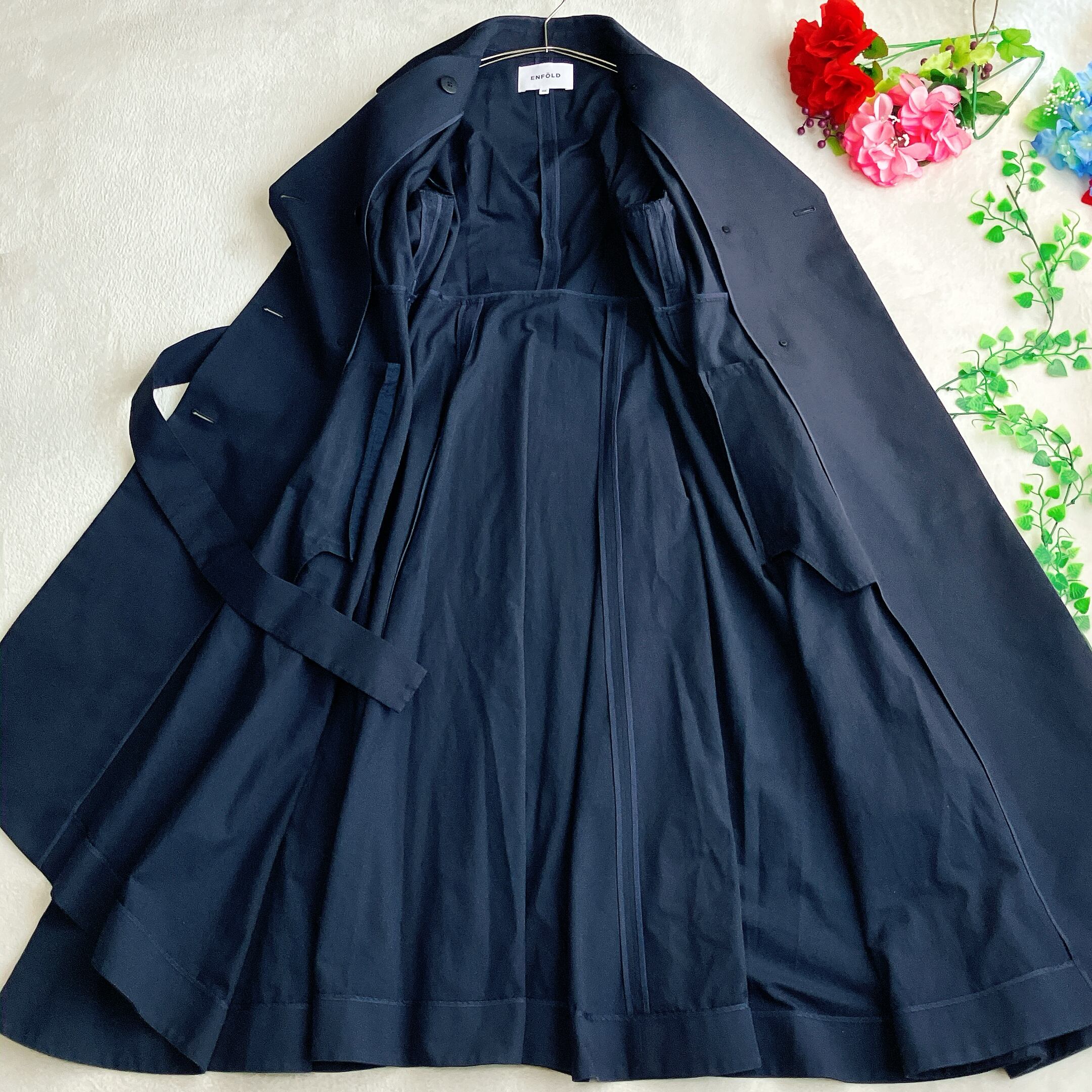 【美品】エンフォルド ENFOLD★ダブル トレンチコート フレア ギャザー マキシ丈 ベルト付き ダークネイビー