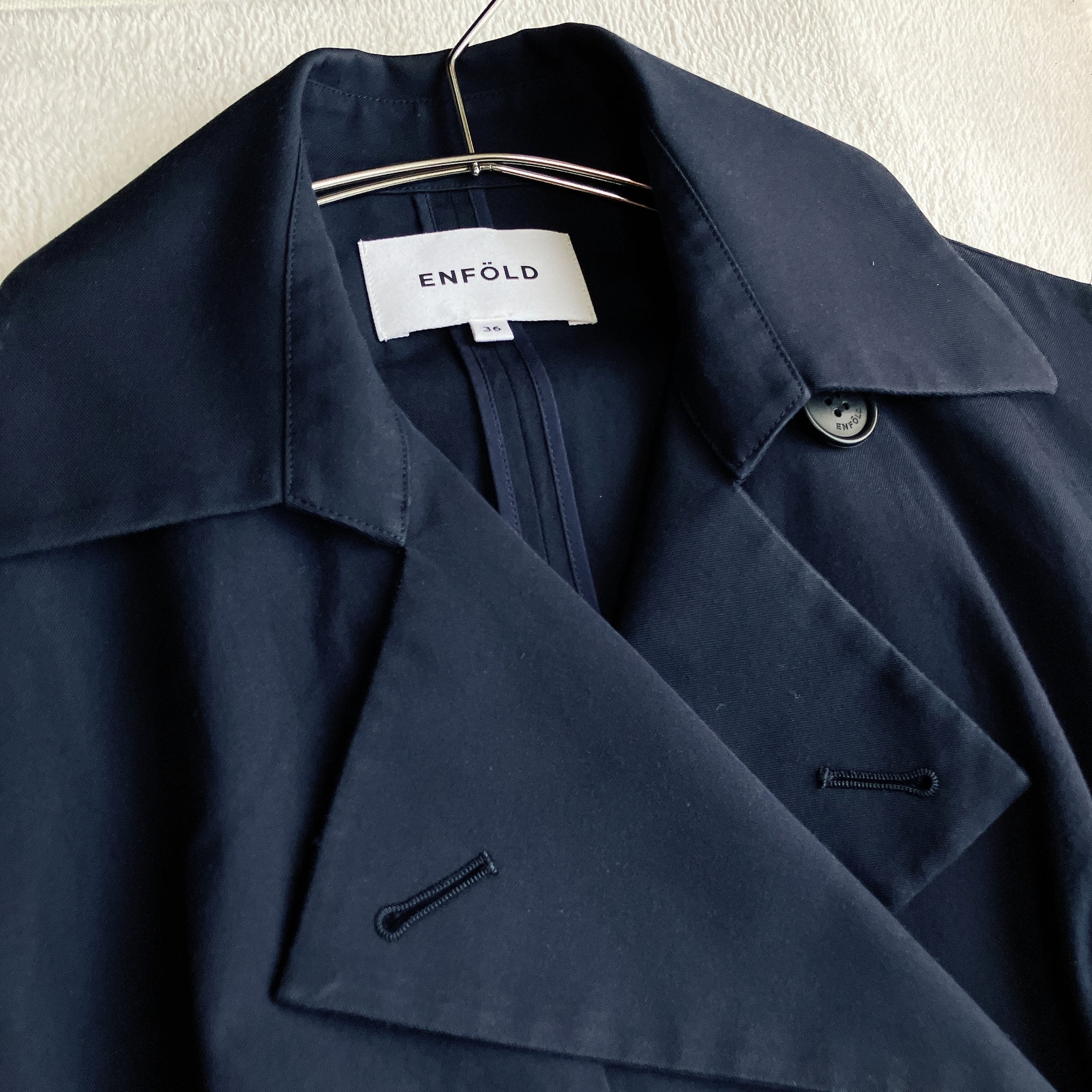 ENFOLDらしい洗練されたシルエットが魅力のダブルトレンチコート。存在感のあるラペルとフロントのダブルボタン仕様が、きちんと感とモードな雰囲気を演出します。ダークネイビーは通勤・通学はもちろん、フォーマルやセレモニー、オケージョンにも活躍する万能カラーです。
